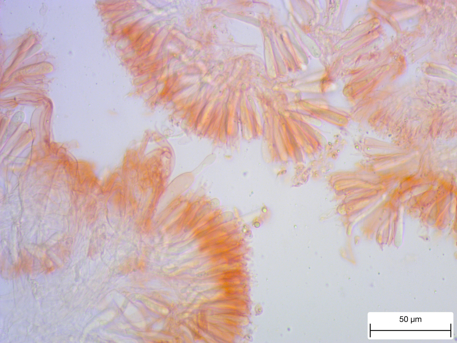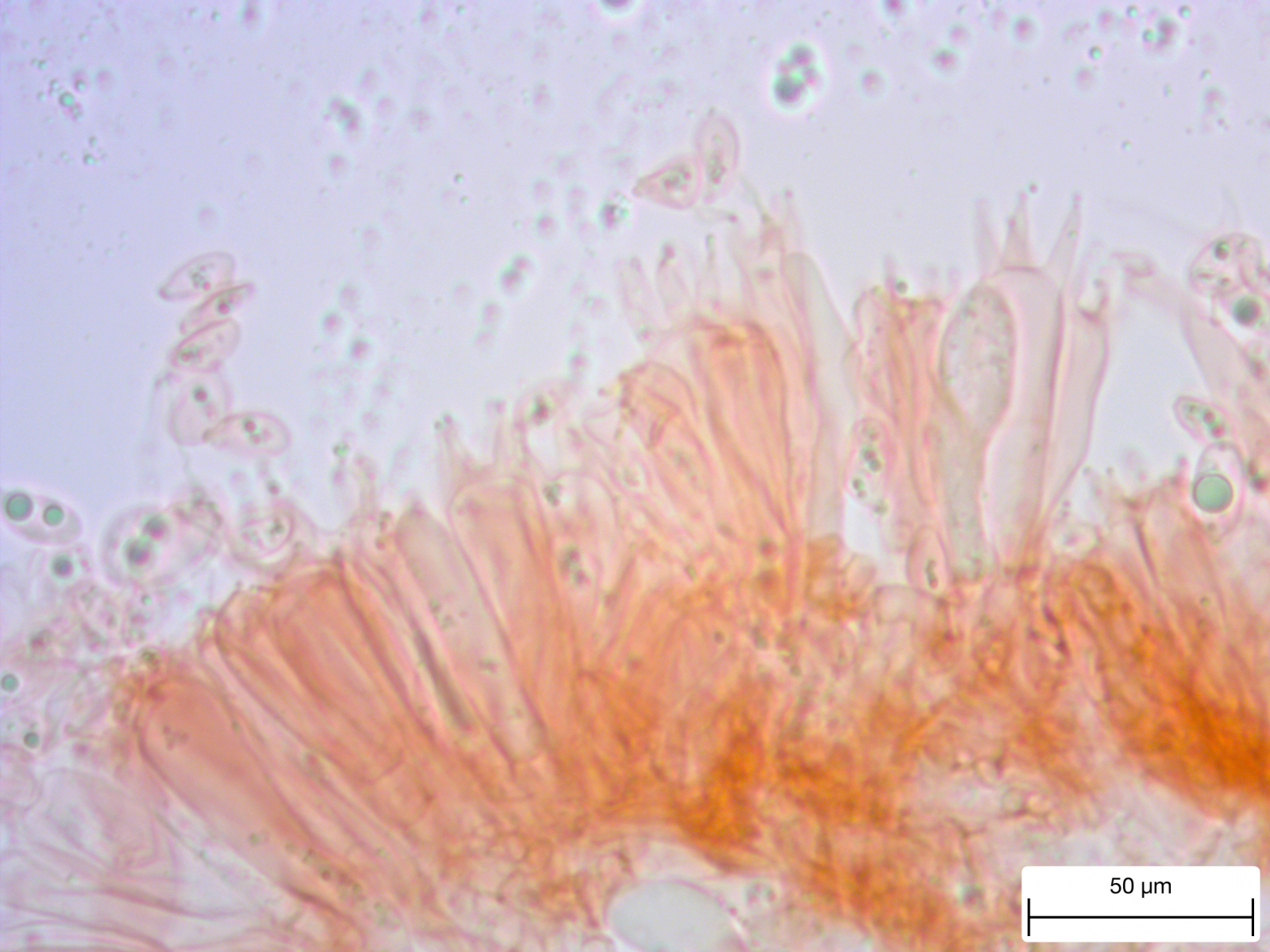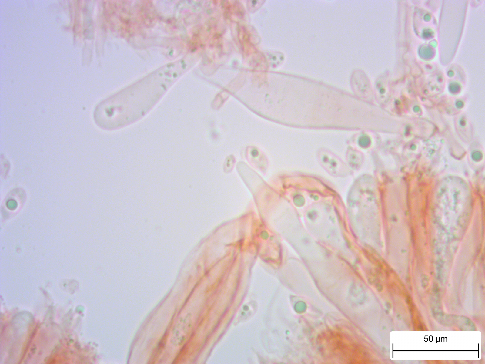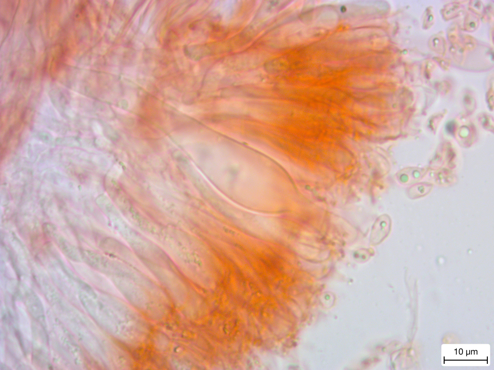 Auffällig sind die sehr auffälligen edit: Basidien Zystiden: flaschen-, spindel-, und keulenförmig