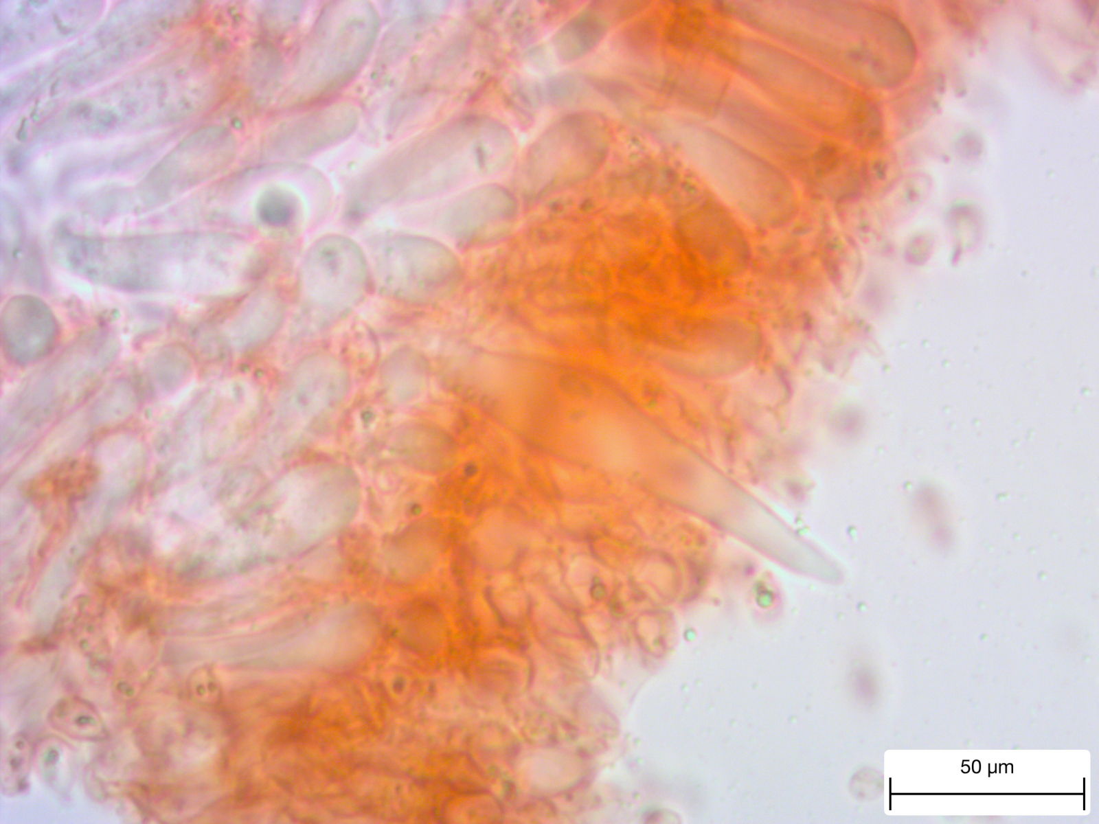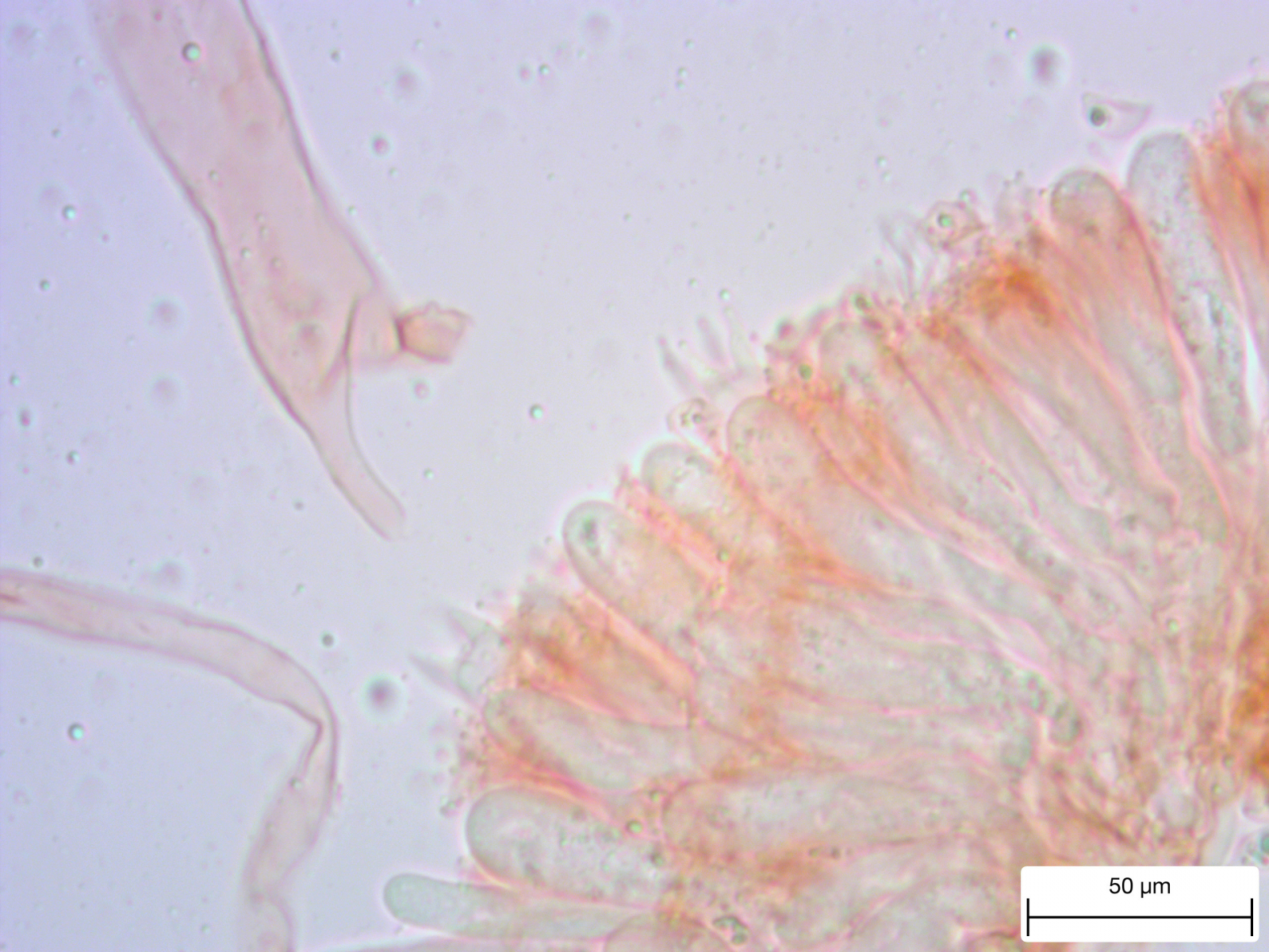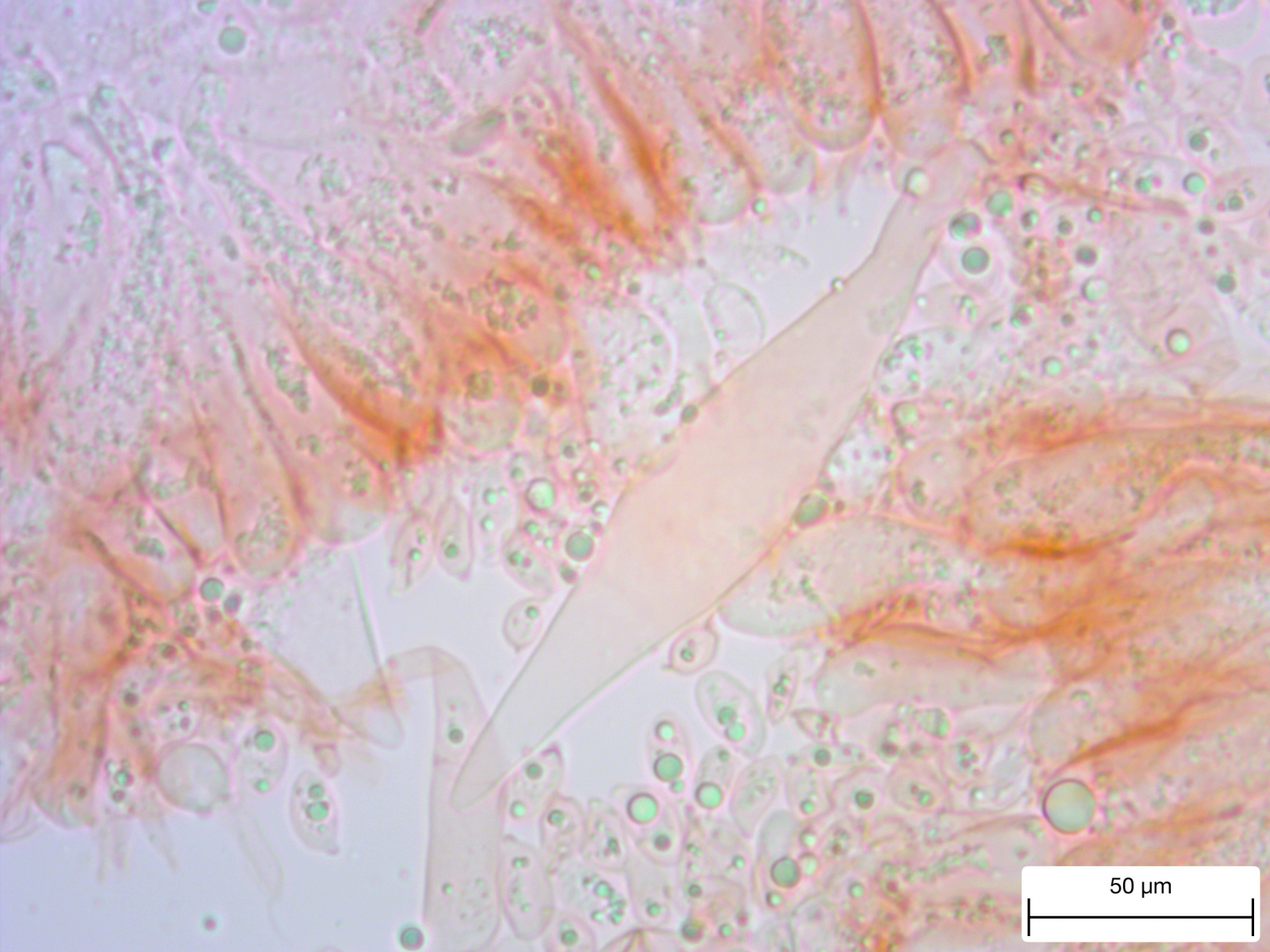 Auffällig sind die sehr auffälligen edit: Basidien Zystiden: flaschen-, spindel-, und keulenförmig