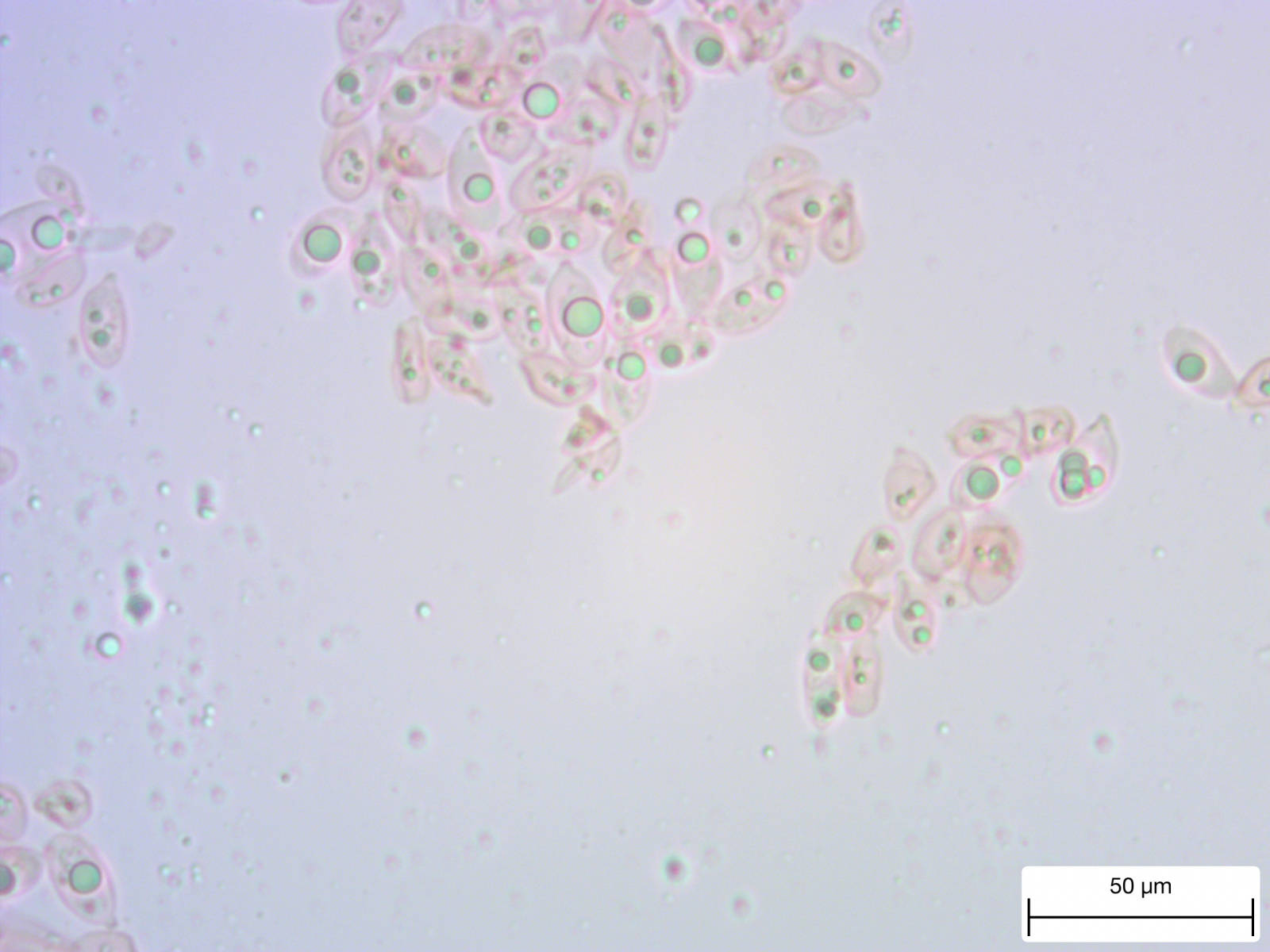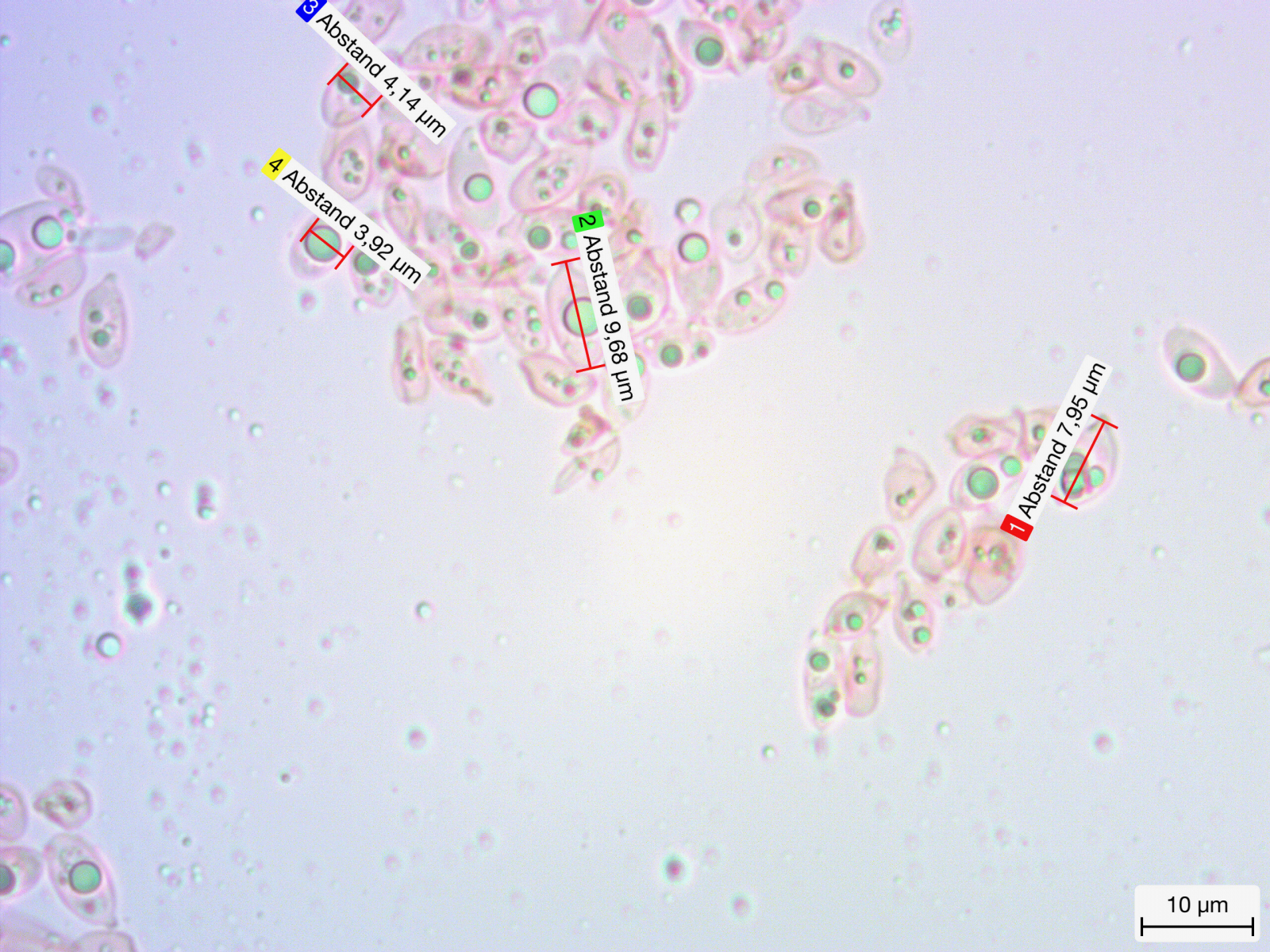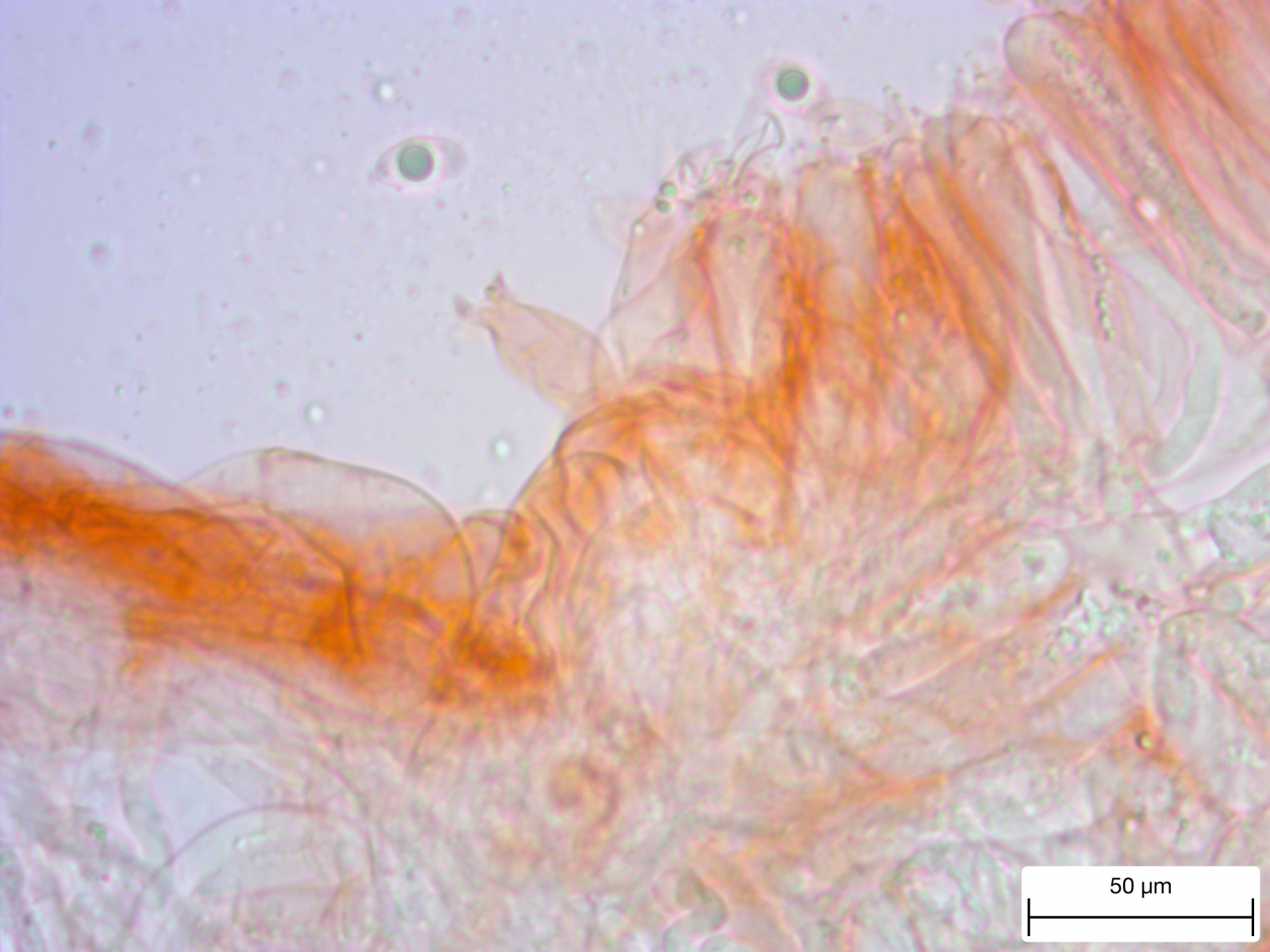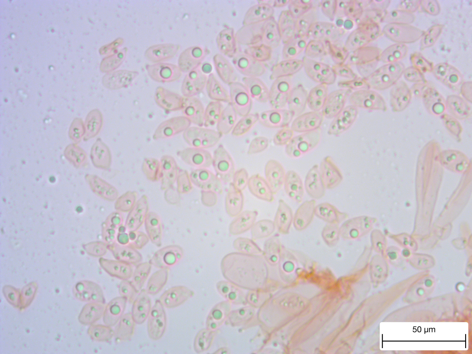 Auffällig sind die sehr auffälligen edit: Basidien Zystiden: flaschen-, spindel-, und keulenförmig