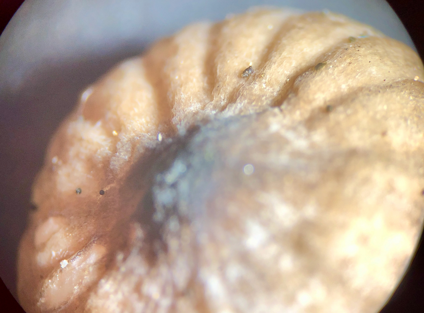 Hut: ca. 1 cm Durchmesser, radial eingedellt, dunkelgraue Papille, ansonsten hellgrau-beige