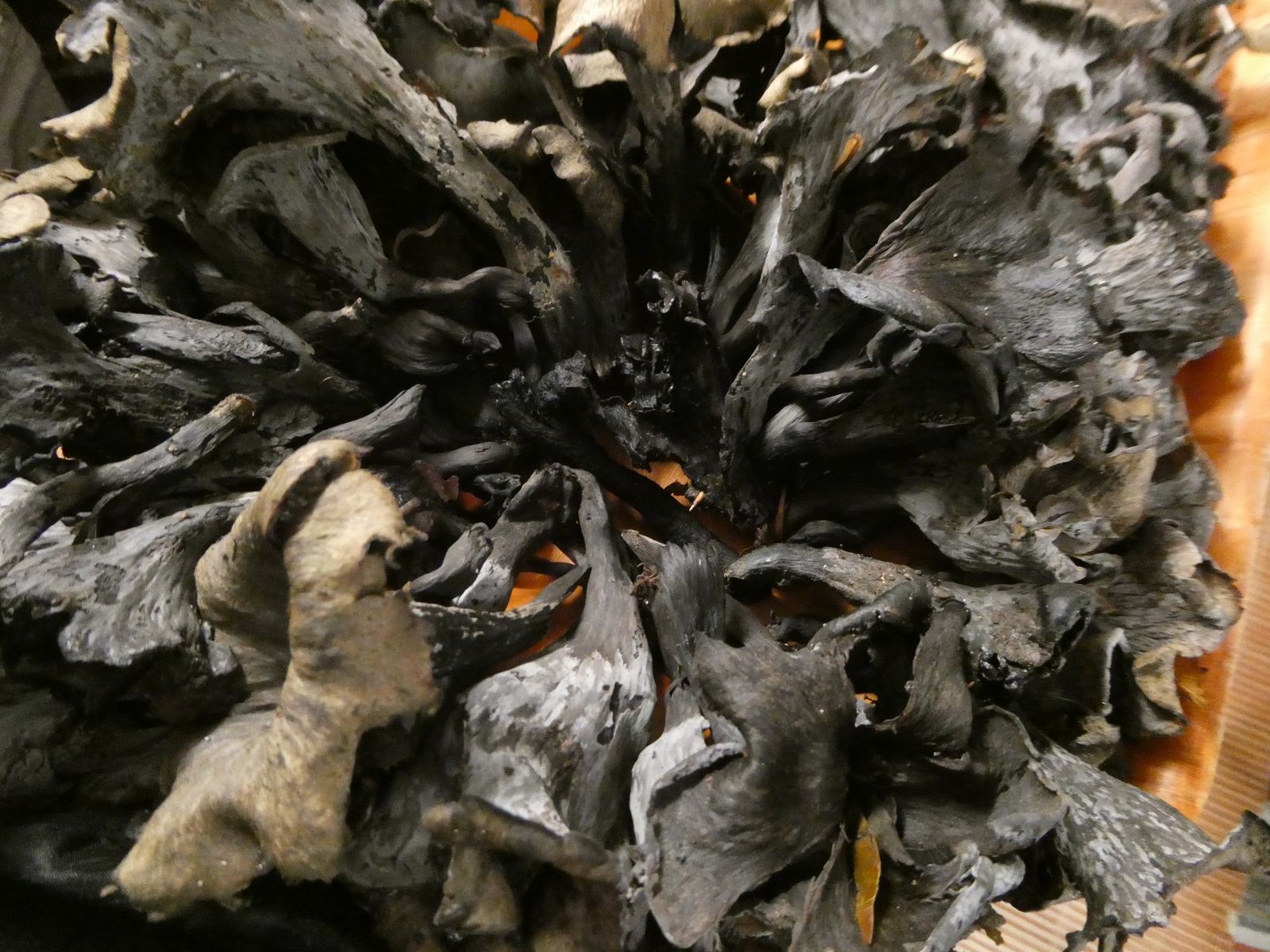 Das Matschige getrocknet ergibt meine Lieblingsgeschmacksnote! Ein normaler Sammler würde die schwarzfeuchten unteren Teile entsorgen, aber das ist das Beste dran. Auch getrocknet im Glas riecht der Teil speziell, wie feiner Camembert.