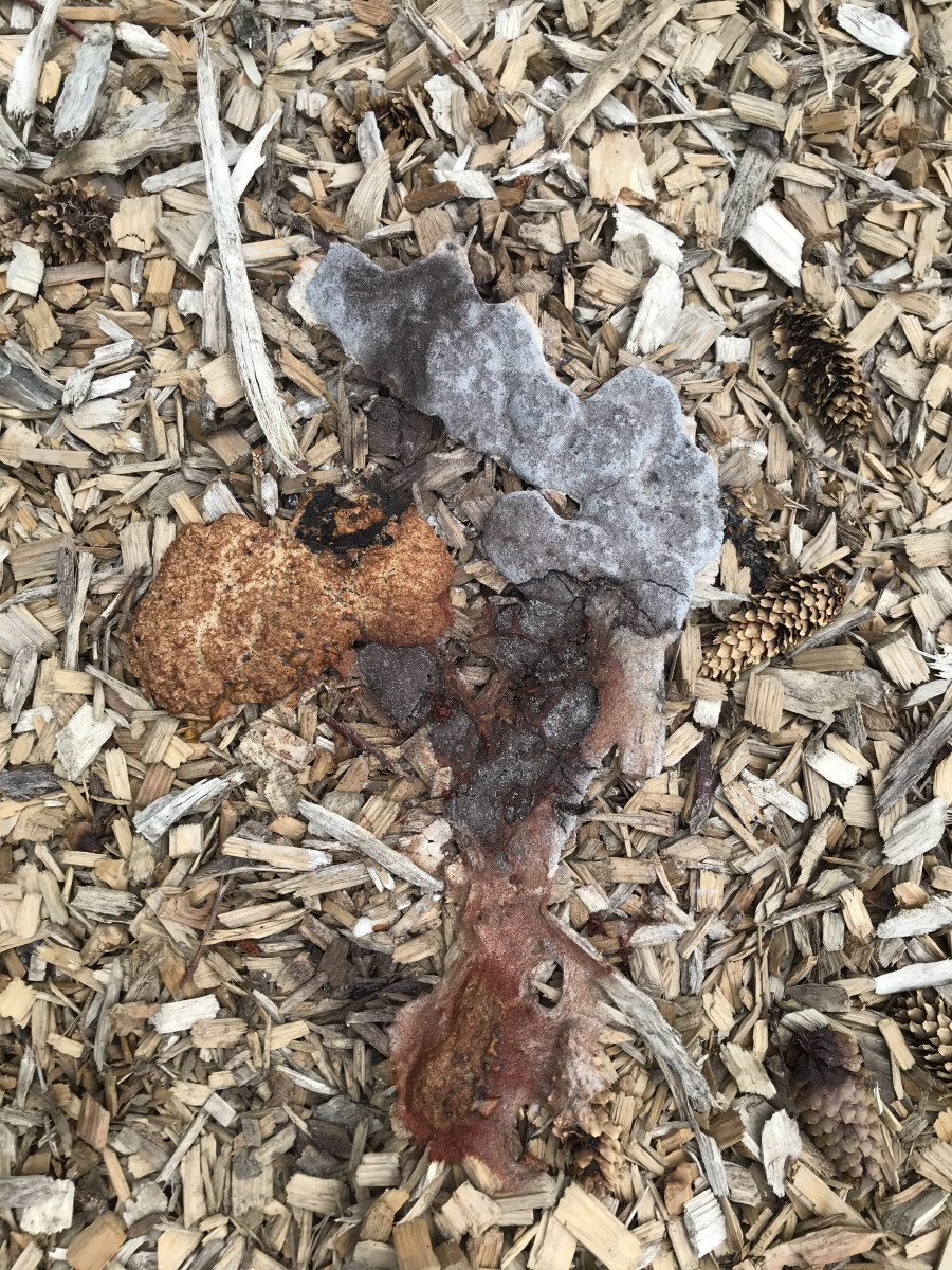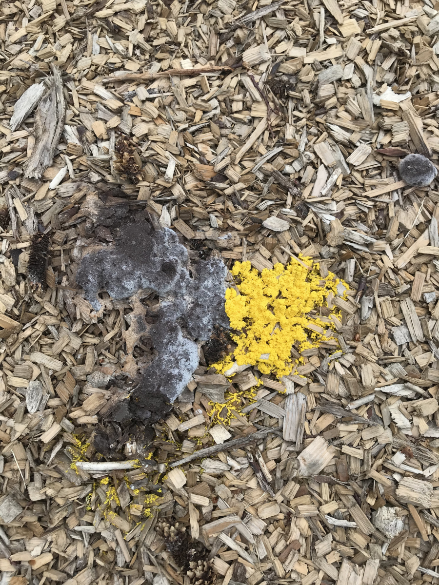 Kurz zur Beruhigung und Ergänzung: Diese Schleimpilze sind völlig harmlos. Da müssten die Kids das Zeug schon in großen Mengen aufessen, daß es auch nur Ansätze geringer Gesundheitsgefährdungen gibt. Der Holzschredder selbst ist vermutlich giftiger als die Myxos darauf (insbesondere, wenn da Holz von Arten wie Robinie, Eibe, Götterbaum usw. verwurstet wurde).