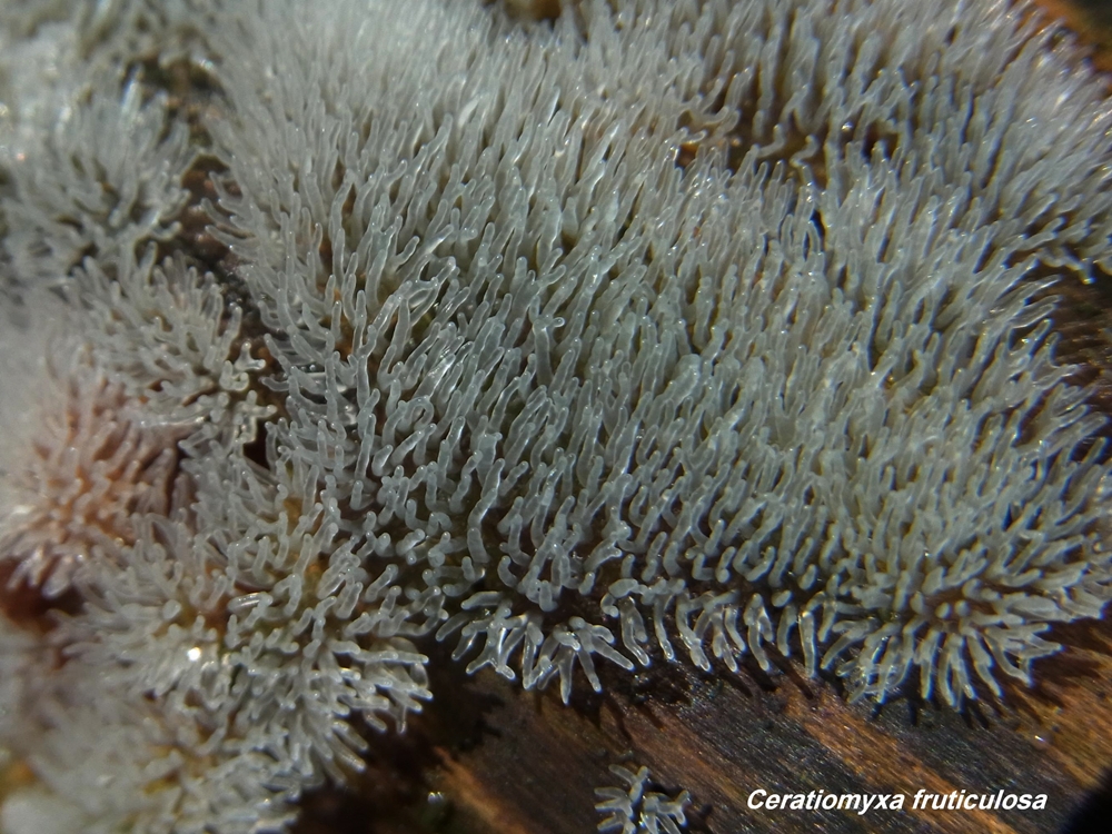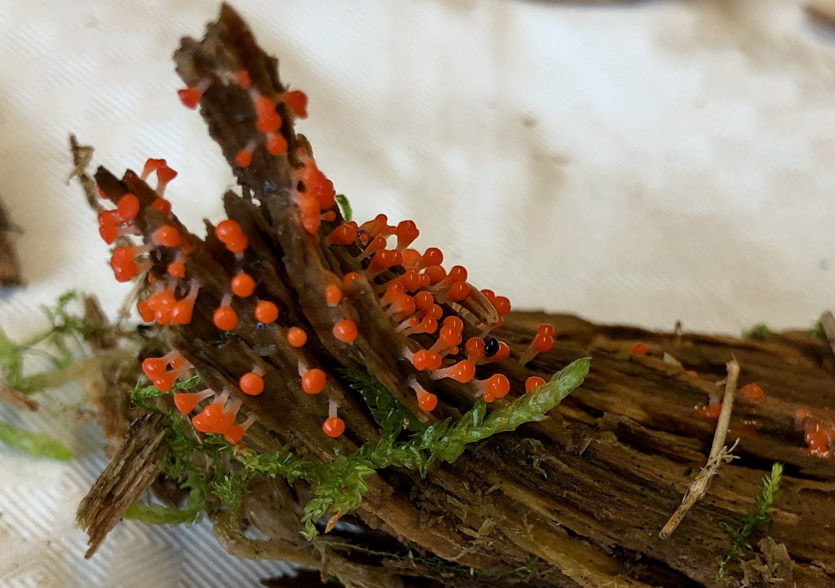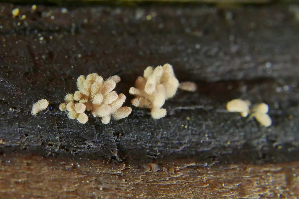 Bilder 1-4: eine verrottete Holzscheibe wies eine große Kolonie eines Schleimis auf, dessen FK büschelig wachsen, und anscheinend schon ziemlich ausgereift sind, da die kleinen "Schaumstoffkeulen" schon herausgekommen sind.