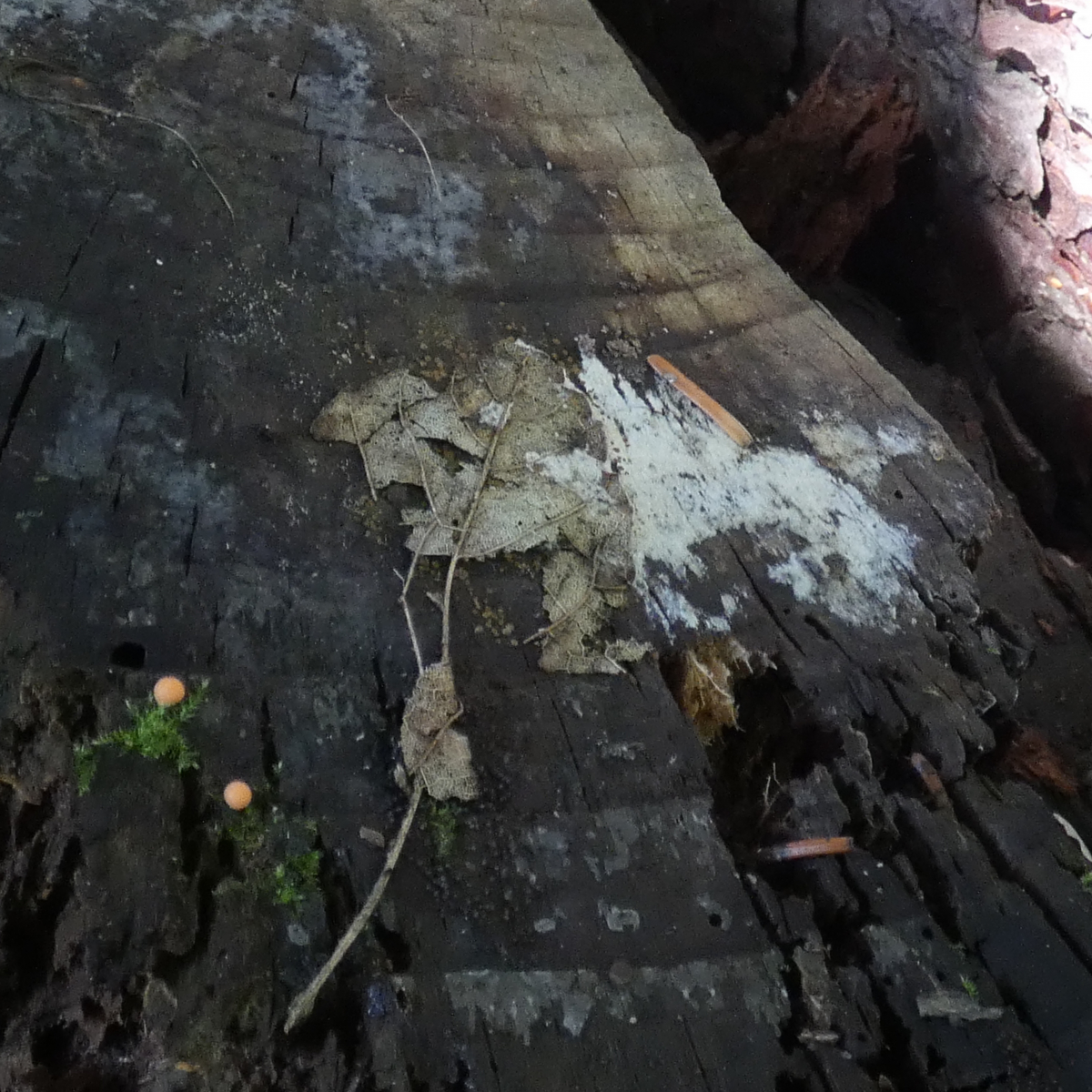Bilder 8+9: Auf dem Holzklotz tummelten sich außer den verschiedenen Schleimpilzen auch noch etliche Arten von echten Pilzen, zB hier der weiße Belag, und diese gelben Knöpfchen. Könnte das eine Orbilia sein?