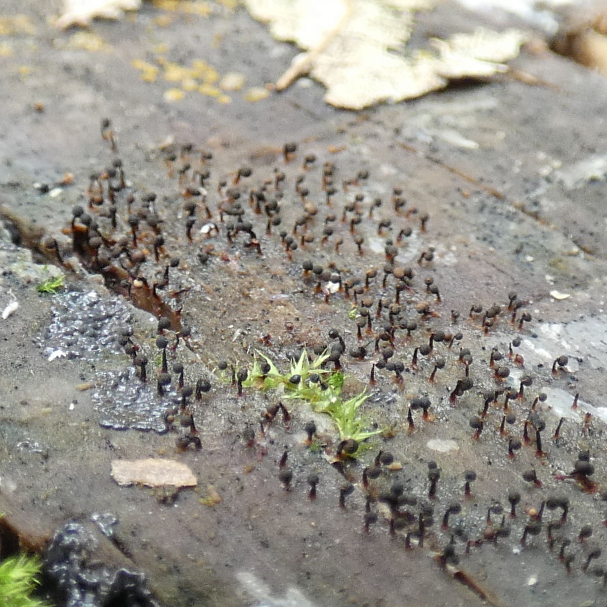 Sooooo....ich konnte Mr. Grüni dafür gewinnen, aus der Kamera noch ein bißchen was rauszukitzeln und meinen Schleimi-Holzklotz nochmal vor die Linse zu nehmen. Einiges wurde nun viel besser sichtbar, zB auch die "schwarzen Pinöpel", die sich nun definitiv als Schleimpilze erwiesen haben. Was aber auch klar wurde, sind die Grenzen unserer Kamera. Mehr an Auflösung geht halt net, und trotz diverser Menüsuchereien, Stativbenutzung und Selbstauslöser, um nicht zu wackeln, wird es irgendwann grisselig.