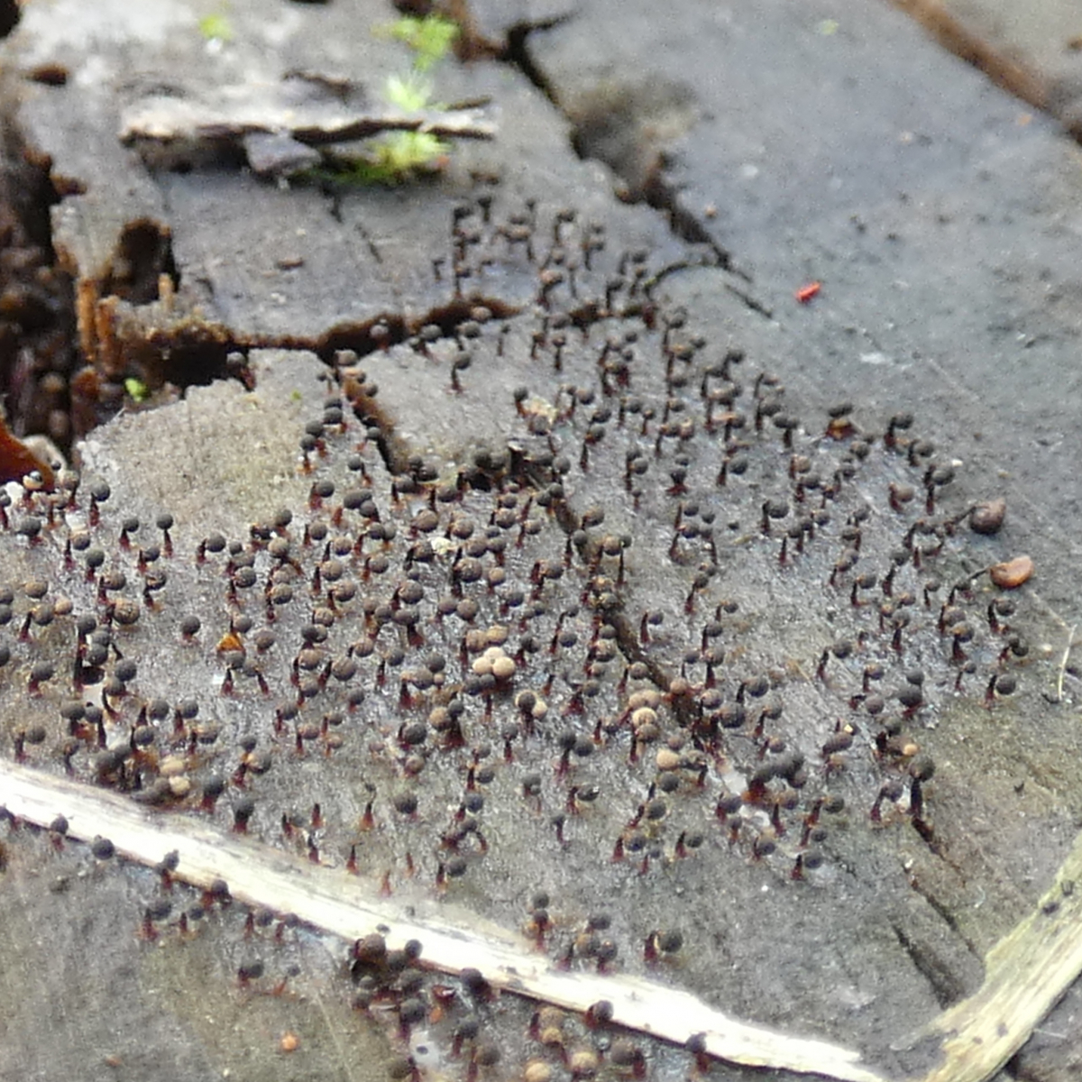 die "schwarzen Pinöpel" sind vielleicht was "besseres". Leider sieht man es im Foto nicht so richtig. Es könnten Schleimis aus der Gattung Cribraria sein. Kannst Du eventuell die Fruchtkörper ernten (dann an der Luft langsam trocknen, danach in eine Streichholzschachtel einkleben). Wenn Du sie mir dann schicken könntest, würde ich versuchen die Art rauszubekommen, wenn Du möchtest.