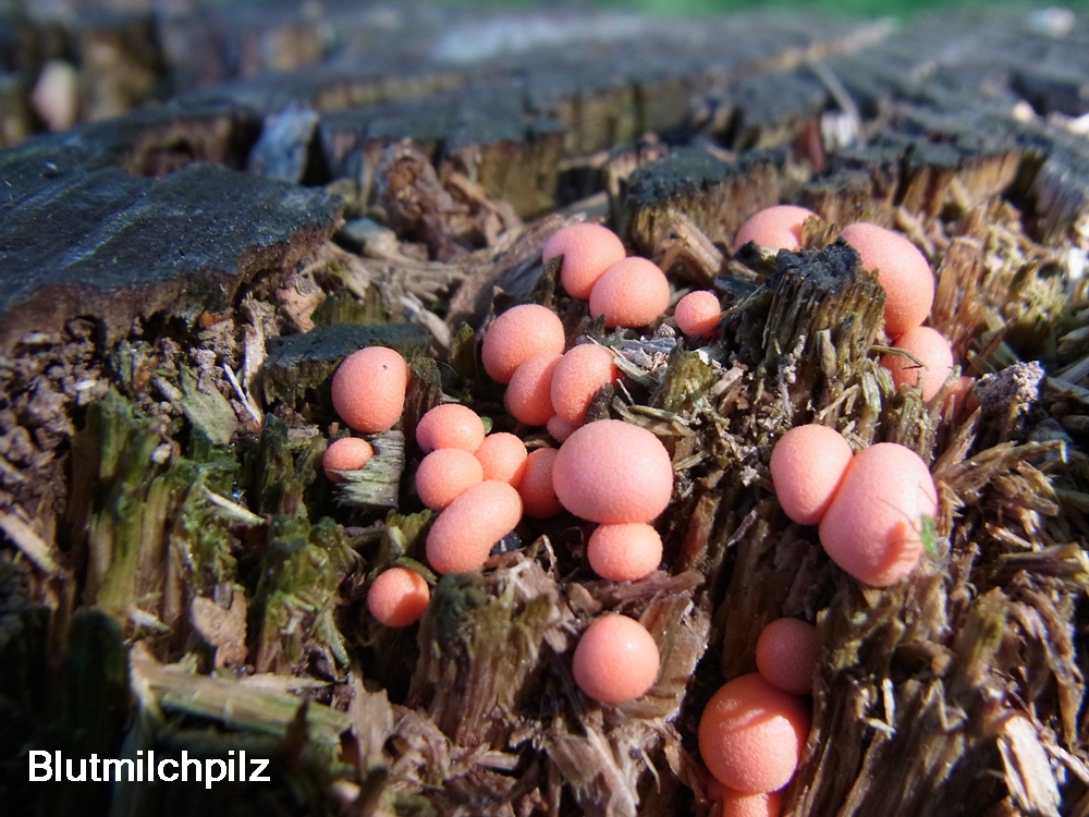 Bilder 5+6: Zwei junge Blutmilchpilzchen, am selben Holzstück. Die schwärzlichen abgestorbenen Pinöpel rechts daneben könnten die FK einer anderen Schleimpilzart, oder vllt auch eines "echten" Pilzes sein. Habe leider erst am Computer gesehen, daß diese auf dem Holz waren, daher nicht näher fotografiert.