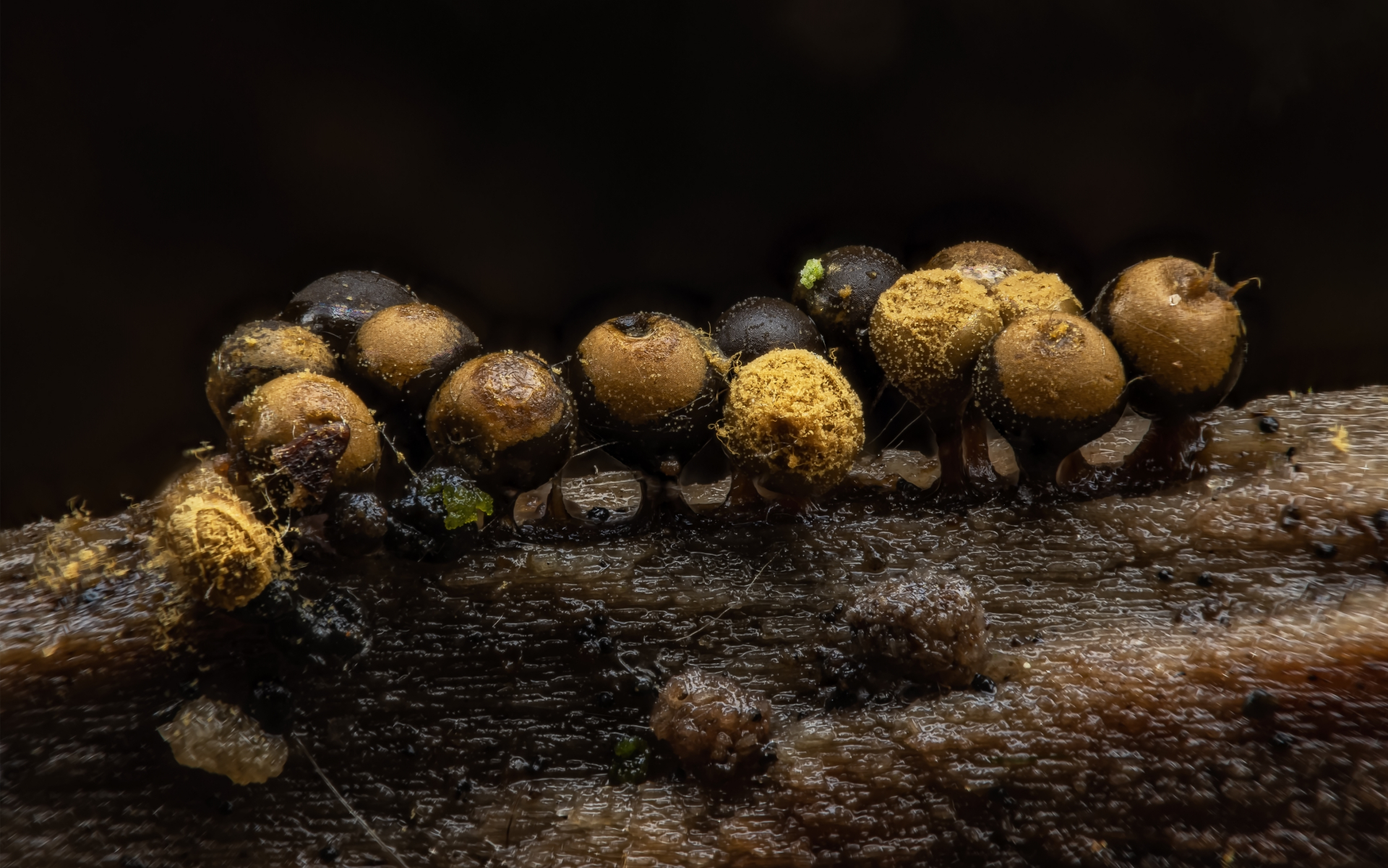 Sooooo....ich konnte Mr. Grüni dafür gewinnen, aus der Kamera noch ein bißchen was rauszukitzeln und meinen Schleimi-Holzklotz nochmal vor die Linse zu nehmen. Einiges wurde nun viel besser sichtbar, zB auch die "schwarzen Pinöpel", die sich nun definitiv als Schleimpilze erwiesen haben. Was aber auch klar wurde, sind die Grenzen unserer Kamera. Mehr an Auflösung geht halt net, und trotz diverser Menüsuchereien, Stativbenutzung und Selbstauslöser, um nicht zu wackeln, wird es irgendwann grisselig.