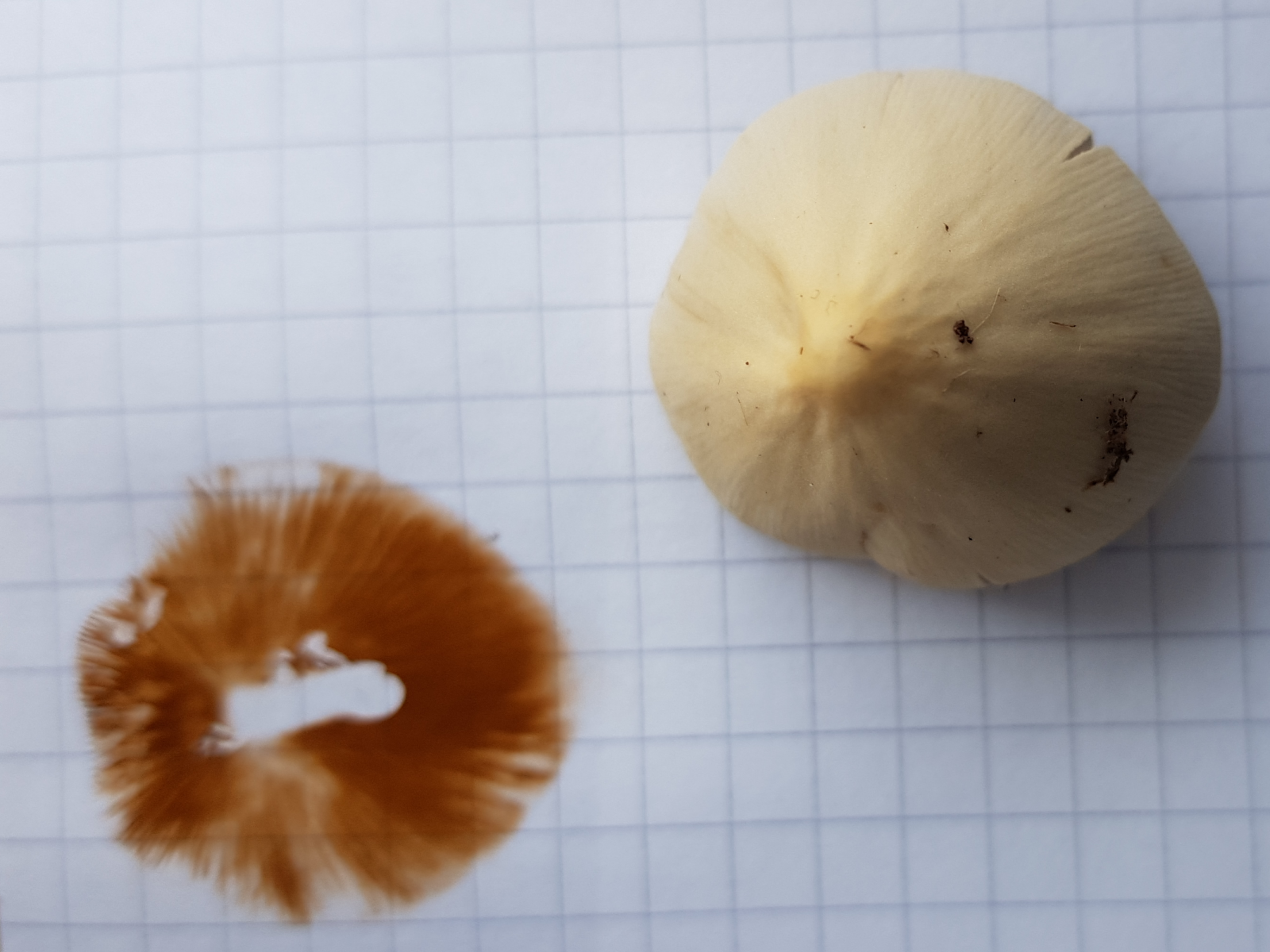 dünnfleischige Hut, glockenförmig, 3 cm breit. Oberfläche matt, trocken tongelblich, Rand ist mehr oder weniger schwach gerieft