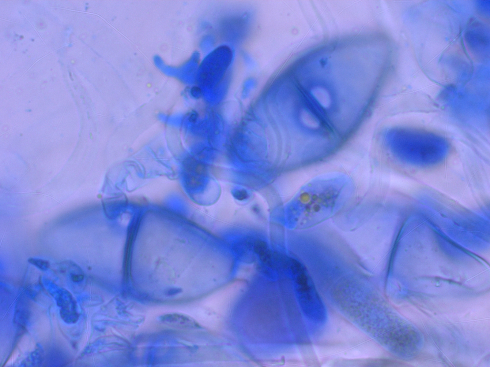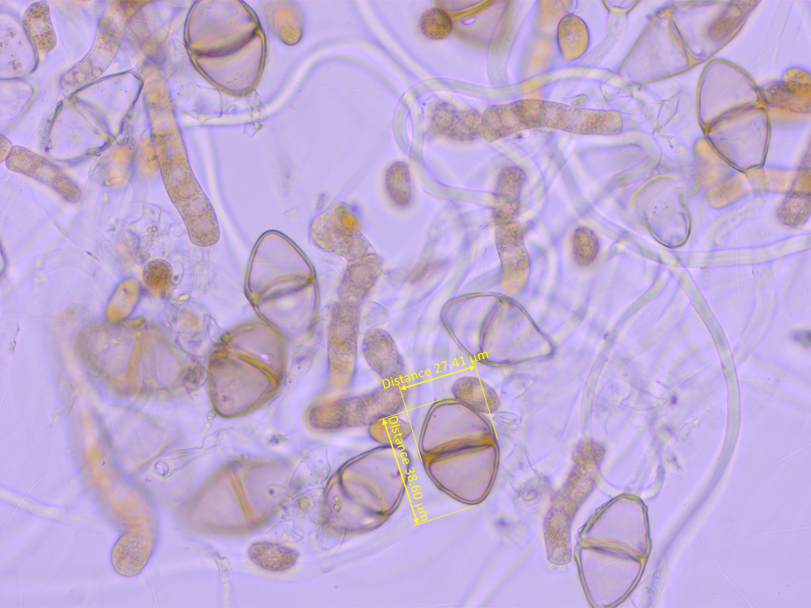 die Keimporen sind leider nicht immer einfach zu sehen, vor allem wenn da keine Kappen drauf sitzen. Da hilft auch Anfärben wenig (bei Grasrosten nimmt man gerne Hoyers Medium um die Keimporen besser sichtbar zu machen, ob das bei Gymnosporangium auch hilft, weiß ich nicht). Bei G. cornutum sollten die Keimporen in der Nähe der Scheidewand oder an der Spitze sitzen, bei G. amelanchieris nahe der Spitze, bei G. tremelloides eine an der Spitze und 2 nahe der Querwand.
