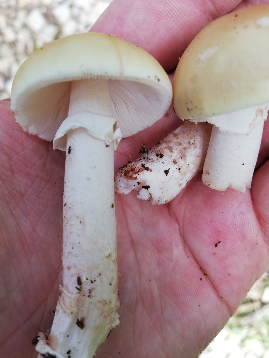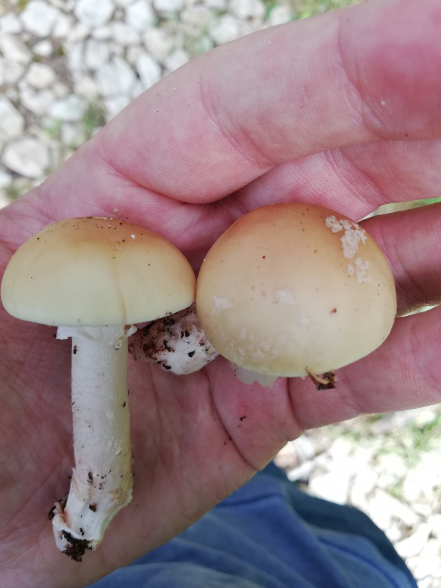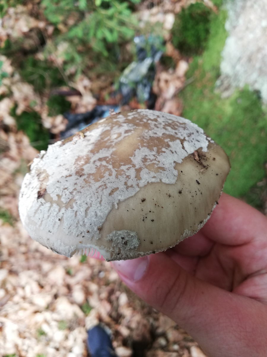 Hier gehe ich von Amanita Rubescens aus, bestimmt durch oberseits stark gerieften Ring und Rötungen im Fleisch. Die rüben artige Knolle erwies sich meist trotz Pilzmesser leider ziemlich schwer auszugraben. Beim letzten bin ich mir unsicher da er nirgends gerötet hat, könnte das vielleicht ein grauer Wulstling sein? Nebenbei hab ich wahrscheinlich circa 30 Perlpilze in allen Altersstadien gefunden, die bis auf 2 allesamt schon angefressen waren, sogar die noch geschlossenen (Bild 5).