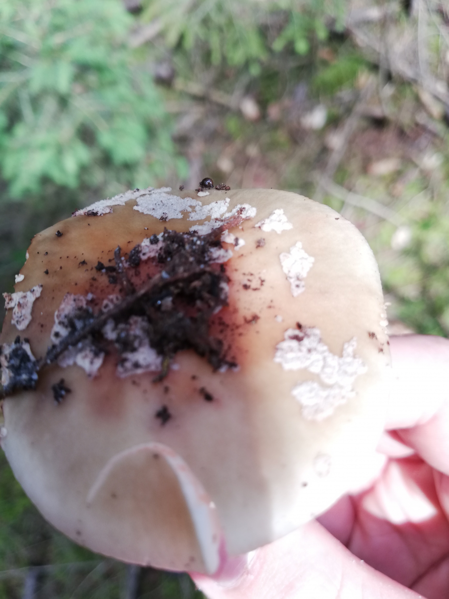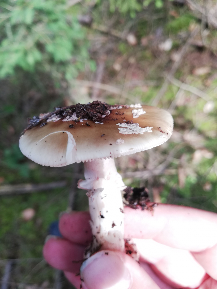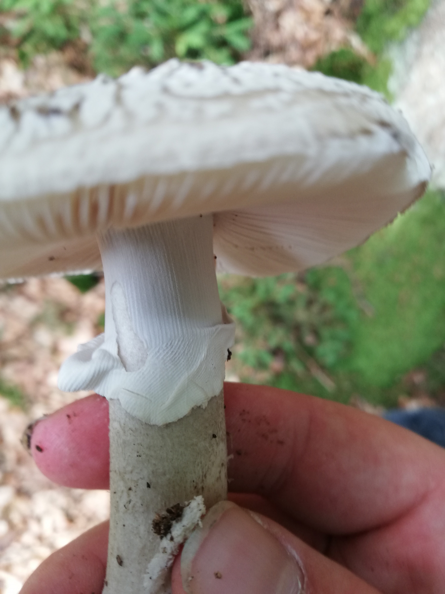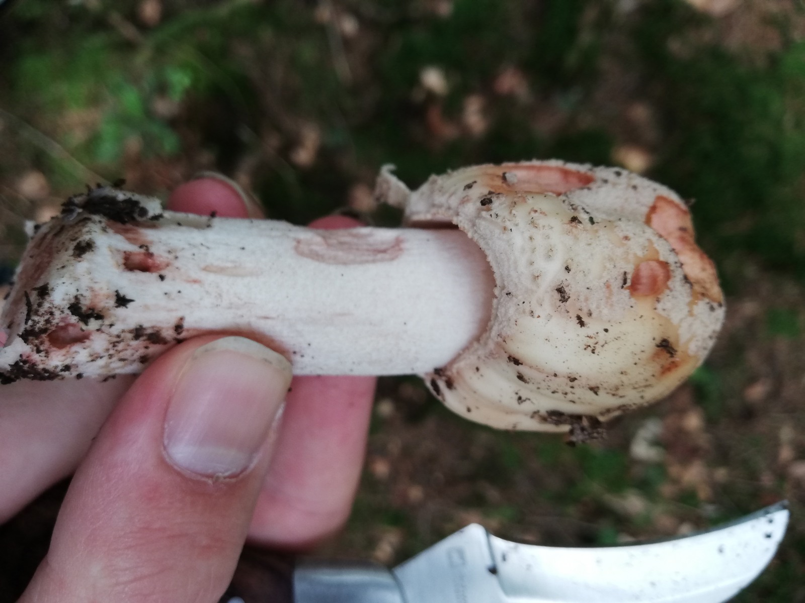 Hier gehe ich von Amanita Rubescens aus, bestimmt durch oberseits stark gerieften Ring und Rötungen im Fleisch. Die rüben artige Knolle erwies sich meist trotz Pilzmesser leider ziemlich schwer auszugraben. Beim letzten bin ich mir unsicher da er nirgends gerötet hat, könnte das vielleicht ein grauer Wulstling sein? Nebenbei hab ich wahrscheinlich circa 30 Perlpilze in allen Altersstadien gefunden, die bis auf 2 allesamt schon angefressen waren, sogar die noch geschlossenen (Bild 5).