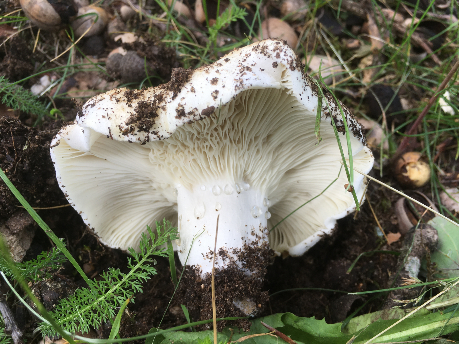26) Na jetzt hätte ichs fast vergessen: um Russulae habe ich bisher einen weiten Bogen gemacht. Die hier habe ich zugegeben auch nur aufgehoben weil ich sie von oben für eine Tricholoma hielt. Aber dann war es zu spät, ich hatte sie schon in der Hand. Also versuch ich mich doch mal. Unter Eiche auf staubtrockenem Sandboden. Geruch hätte durchaus auch für einen Ritterling durchgehen können. Schön nach Mülltonne. Auffallend war ein leich(t) grünlicher Schimmer der Lamellen im Schräglicht, den ich leider nicht fotografisch festhalten konnte. Außerdem die Guttation auf dem Stiel. Mit meiner bescheidenen Literatur könnte ich mir hier R. delica den blaublättrigen Weisstäubling vorstellen?
