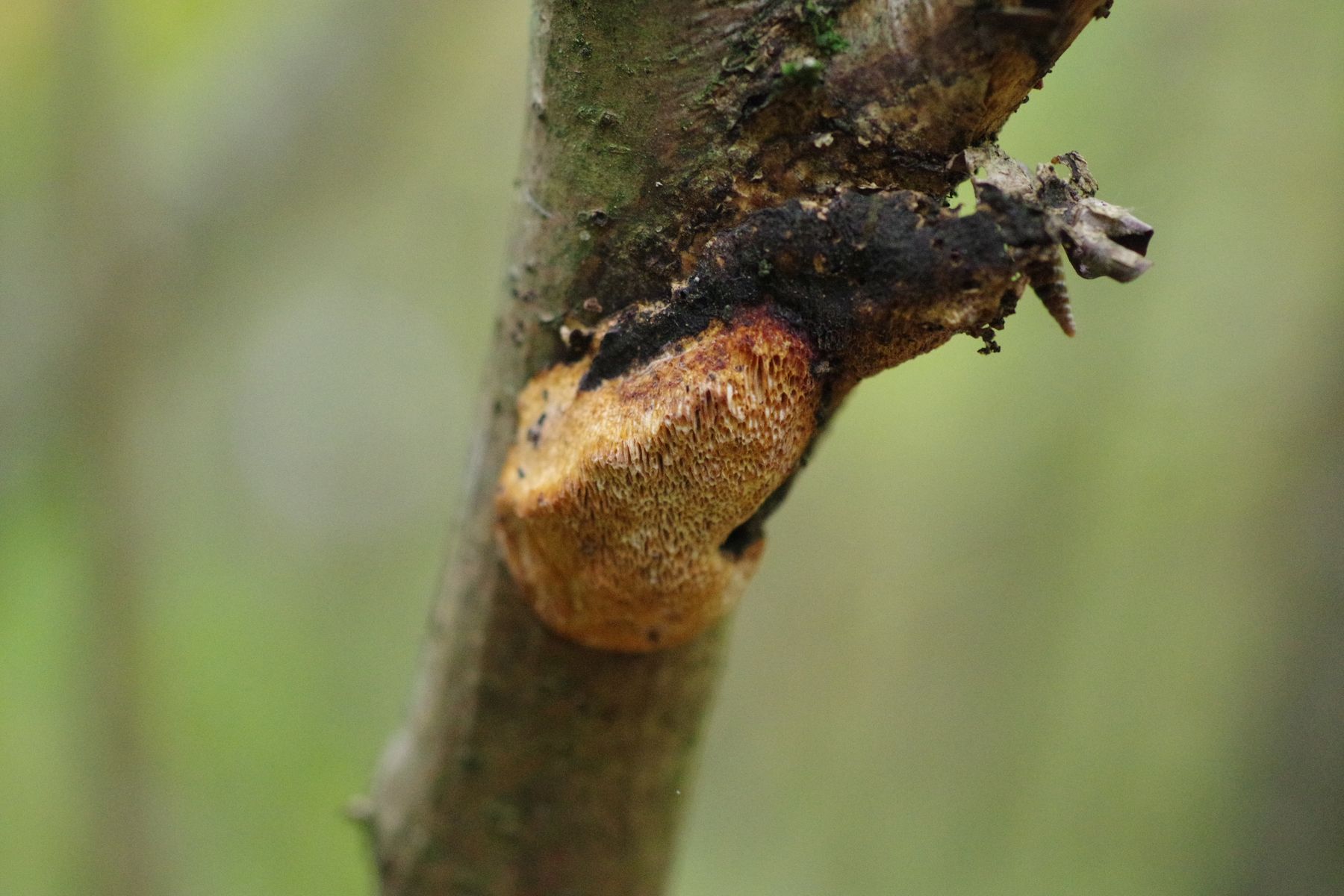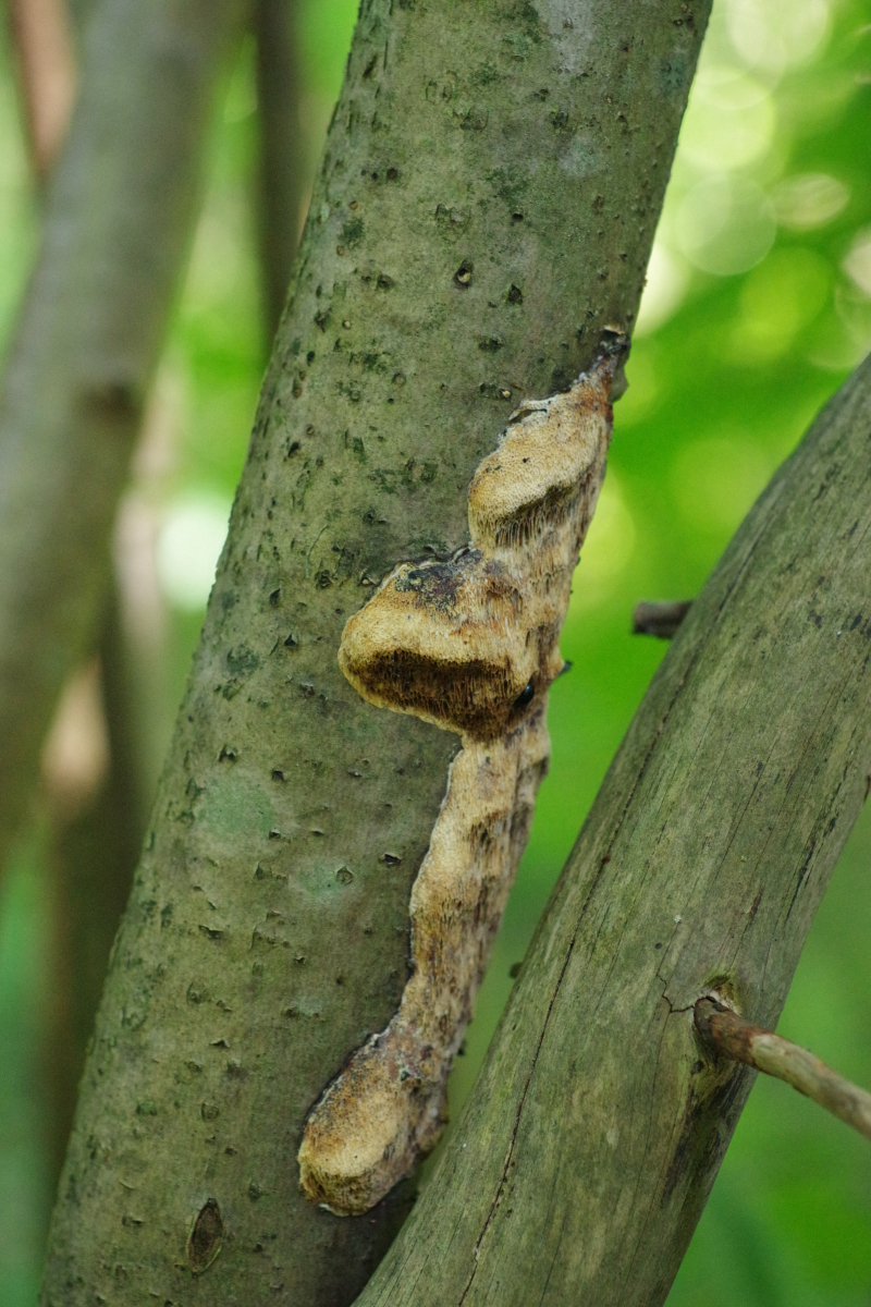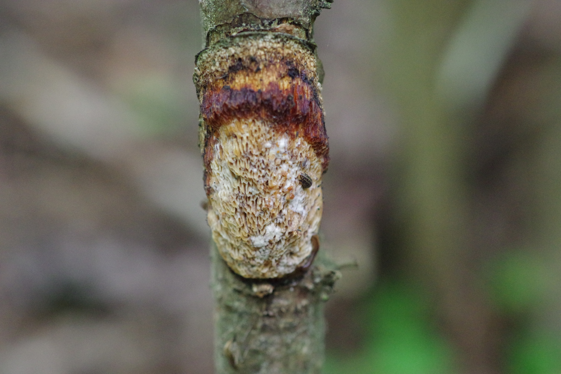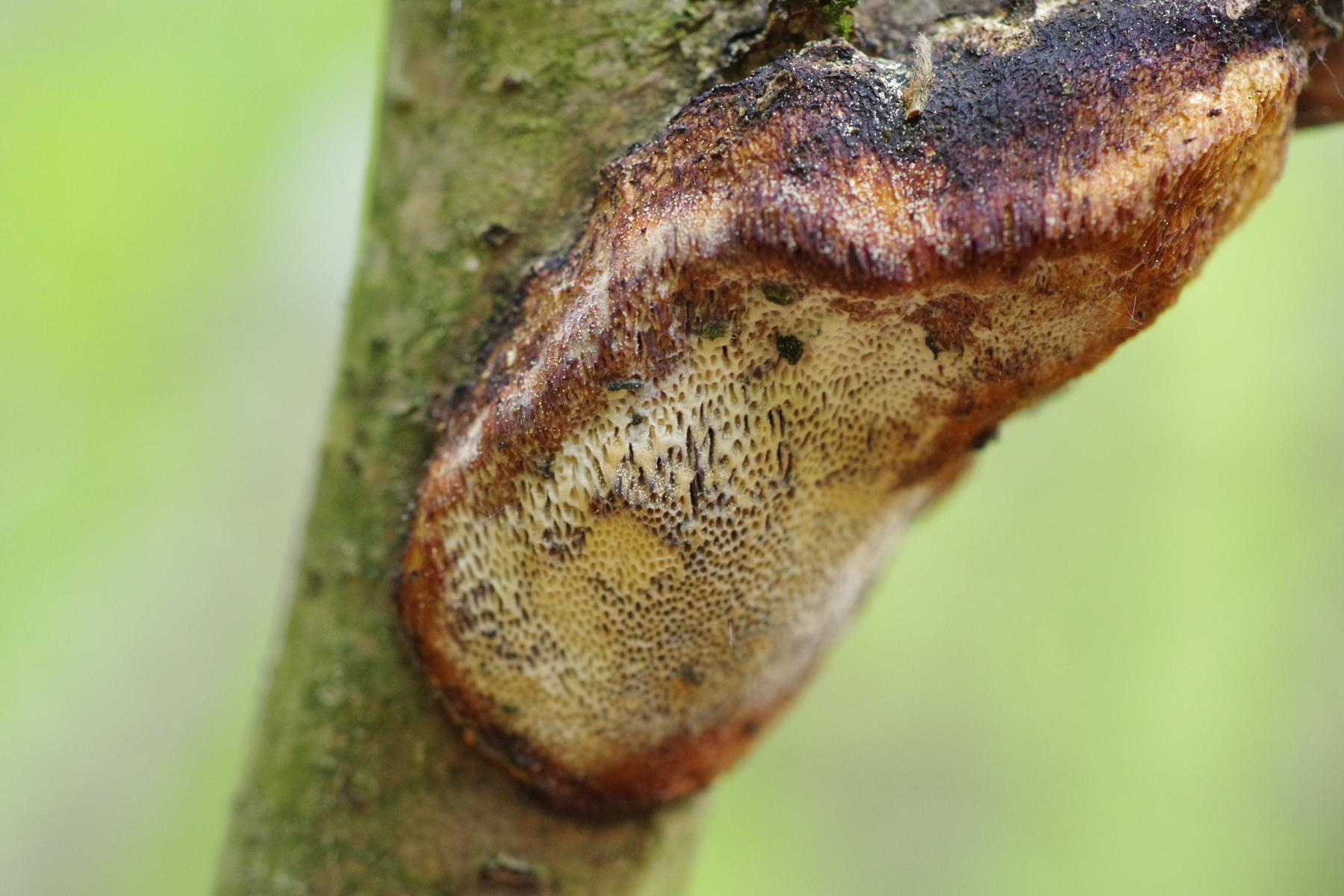 Allerdings hatte ich auch diesen Fund an einem Haselstecken, den ich vermutlich im vorigen Jahr gesund dem Wald entnommen hatte (als mobiler Zaunpfahl) und der im Sommer einige Wochen ungenutzt auf der Weide lag. Der hat sich auch einen Dichomitus campestris eingefangen - und da stimmt das campestris dann sogar mal.
