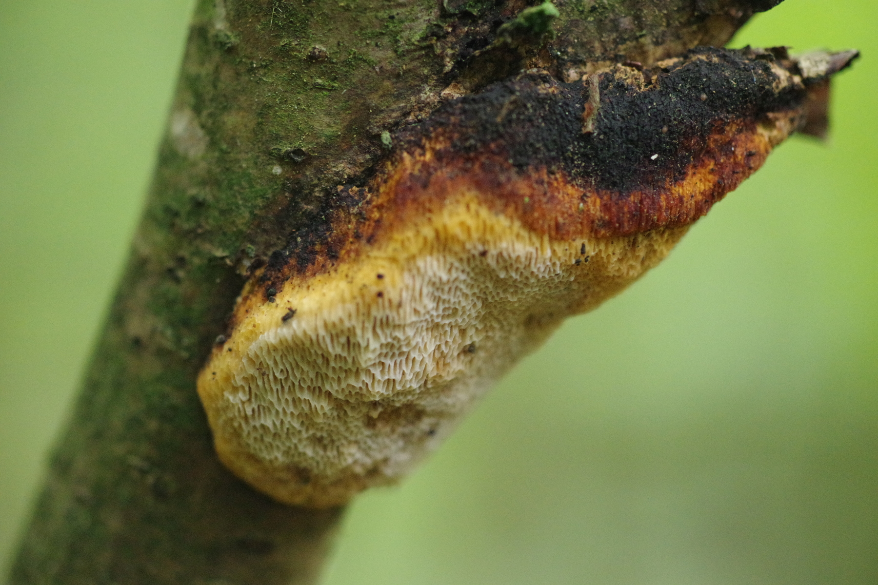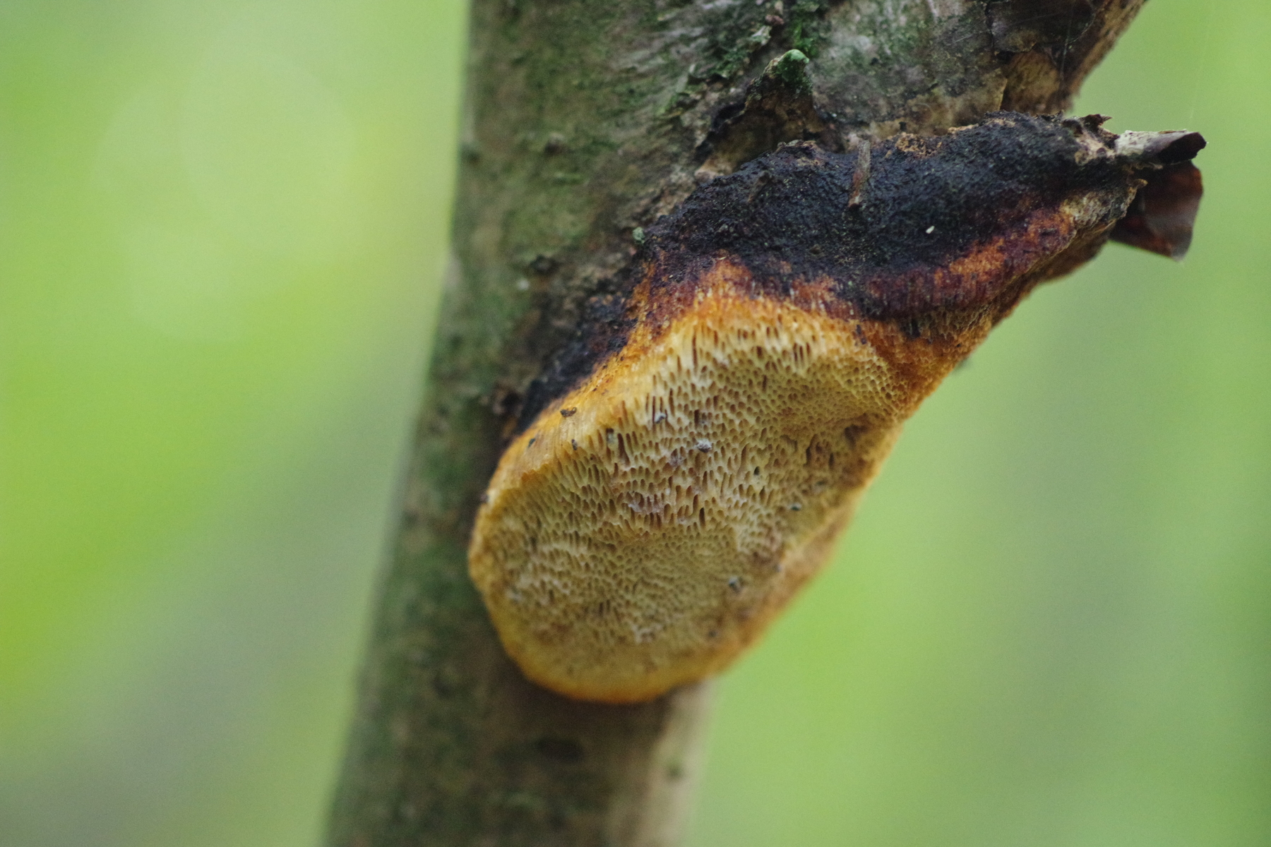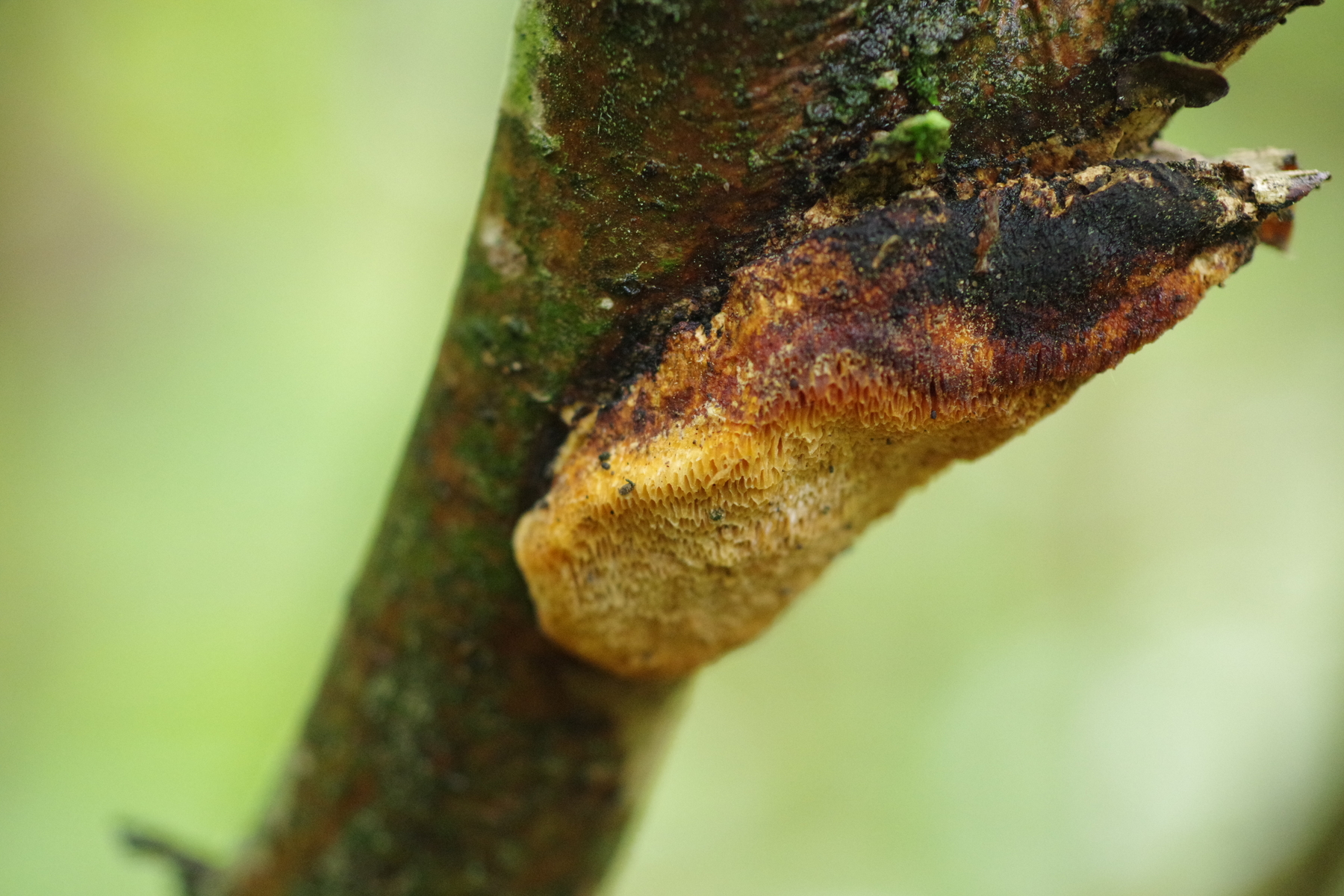Allerdings hatte ich auch diesen Fund an einem Haselstecken, den ich vermutlich im vorigen Jahr gesund dem Wald entnommen hatte (als mobiler Zaunpfahl) und der im Sommer einige Wochen ungenutzt auf der Weide lag. Der hat sich auch einen Dichomitus campestris eingefangen - und da stimmt das campestris dann sogar mal.