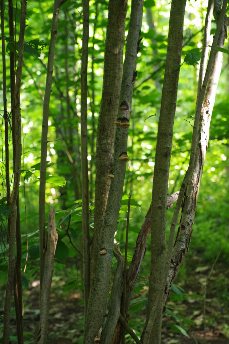 • Hallo allerseits, die Fotoserie vom vergangenen Jahr kann ich nun fortsetzen, da das Wachstum in diesem Jahr abgeschlossen sein dürfte. Mittlerweile erstrecken sich meine Beobachtungen auf 4-500 Stück dieser Pilze, das Gros ganz in der Nähe, die anderen Funde korrespondieren mit der Annahme, dass es sich um eine Pionierart handelt, die bevorzugt in Wäldern wächst, die nach Kahlschlag, Plenterschlag oder natürlicher Kalamität in Ruhe gelassen wurden und zunächst sehr viel Haselbestände hatten, bis dann die neuen Bäume die nach 20-30 Jahren wieder überwachsen, beschatten und zum Absterben bringen. Überwiegend sind die mehrjährig, auch nach dem Abbrechen der Zweige können die weiterwachsen, am Boden oder in der Luft hängend. Davon habe ich auch Fotos, aber nicht so gründlich dokumentiert.