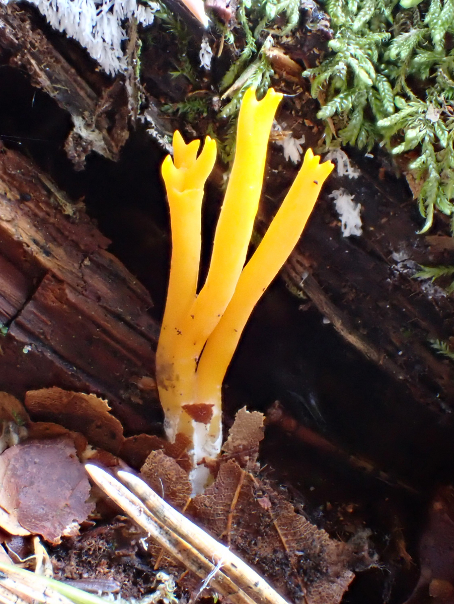 9 Jetzt mal kein Schleimpilz, Calocera viscosa Zwergerlfeuer/Klebriger Hörnling; im Hintergrund dann doch wieder der allgegenwärtige C. fruticulosa