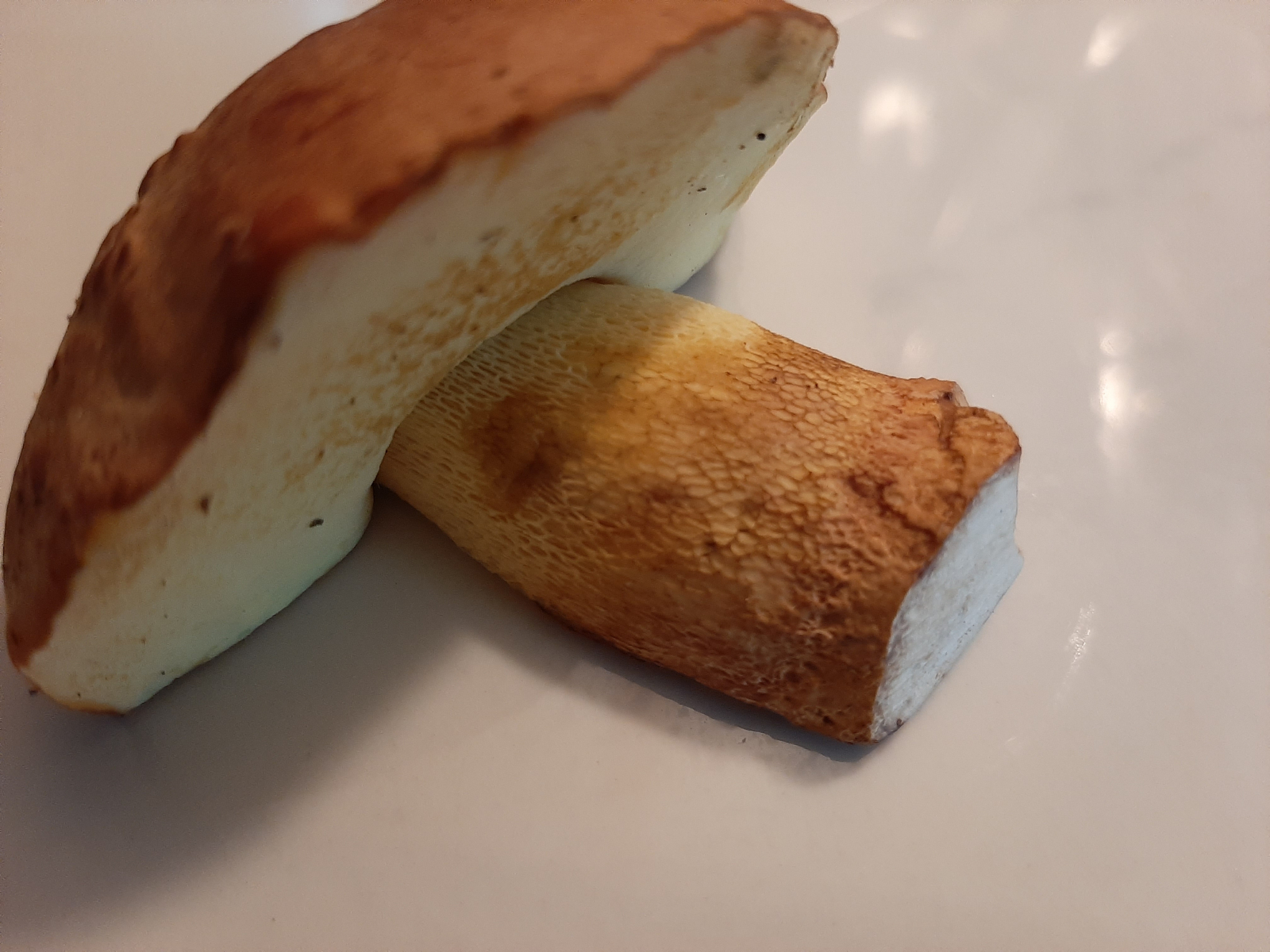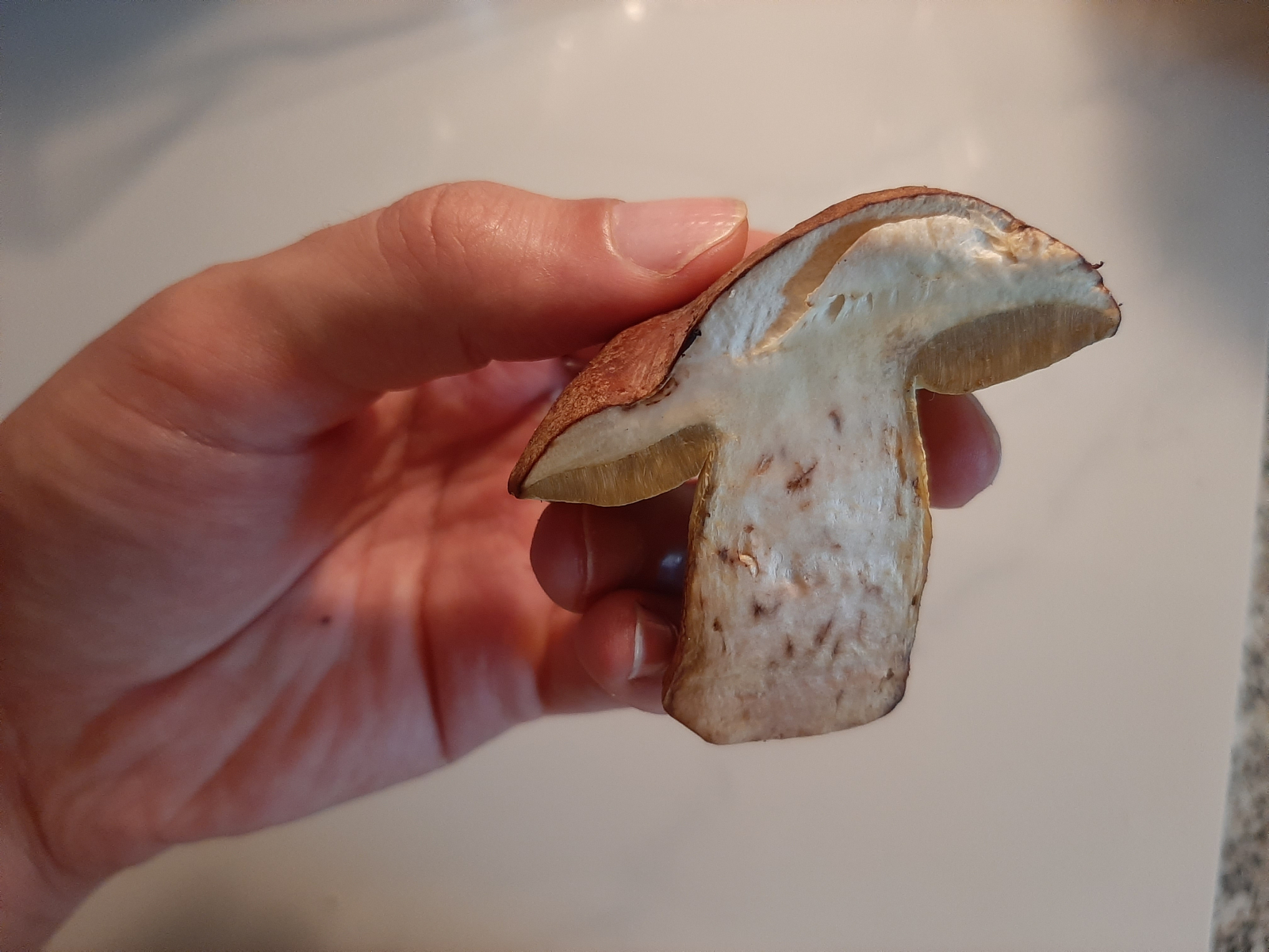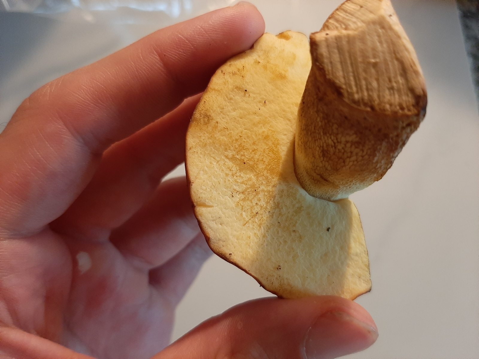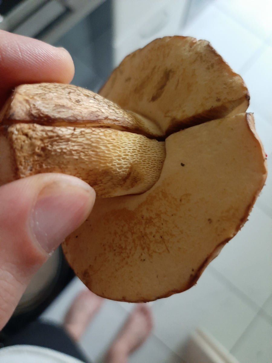 • Der Stiel war komplett gelb und er hatte eine gelbe Netzzeichnung (wie ganz oben am Stiel auf dem Foto). Das braune am Stiel kam erst Stunden nach der Ernte hinzu. Röhren sind ganz fein und komplett gelb. Das rosane an der Schnittstelle kam NUR im Fleisch vor. Anhängselröhrling würde tatsächlich gut passen Oehrling.