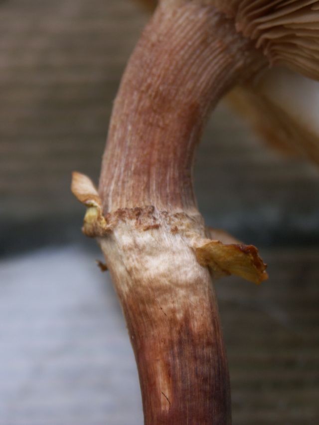 langer, glatter ziemlich gerader Stiel mit Ringansatz oben heller und unten ziemlich dunkel.