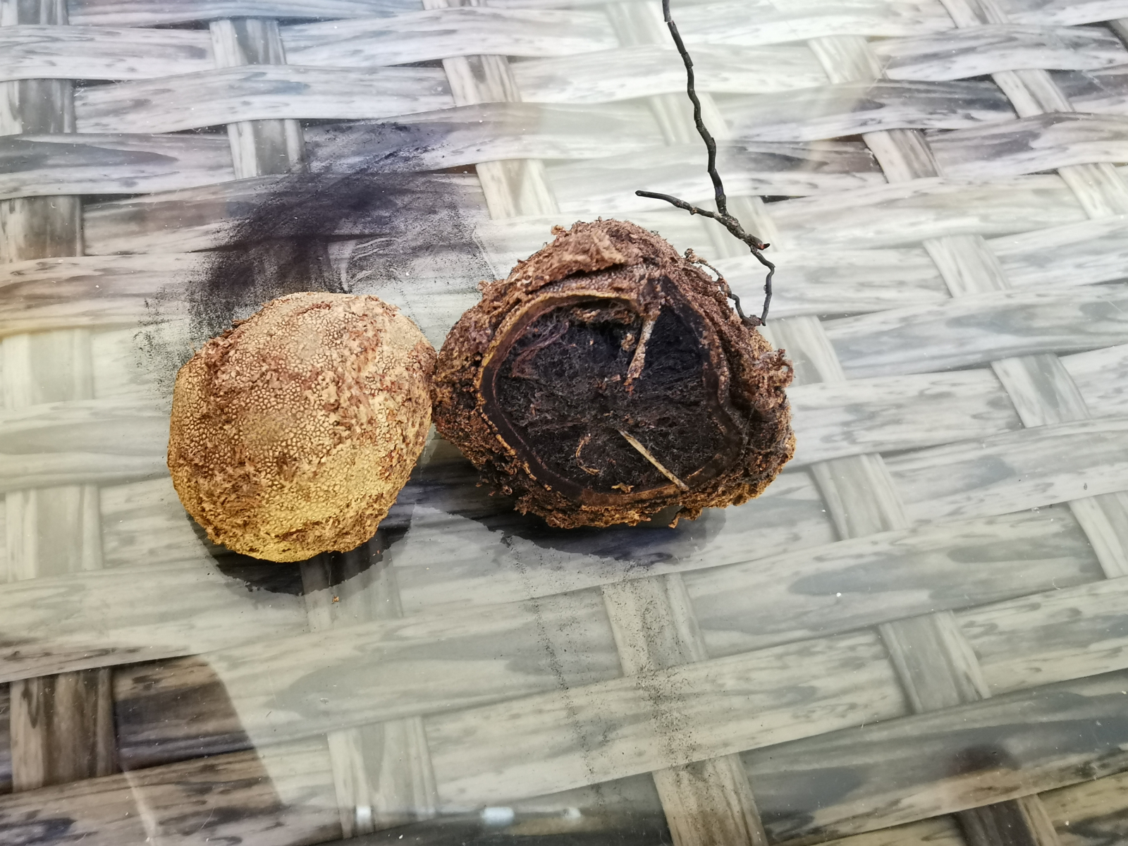 Die Außenhülle ist sehr hart, gelb-braun. Geruch neutral. Innenschicht schwarzes Pulver.