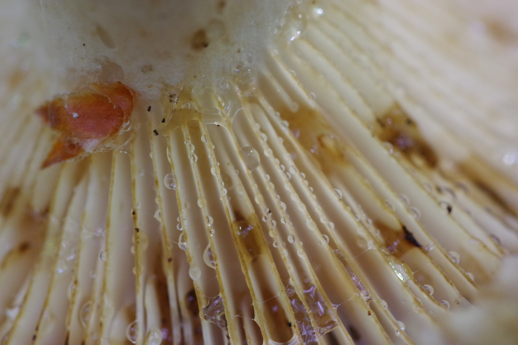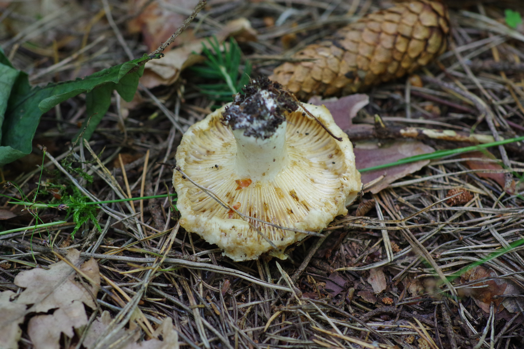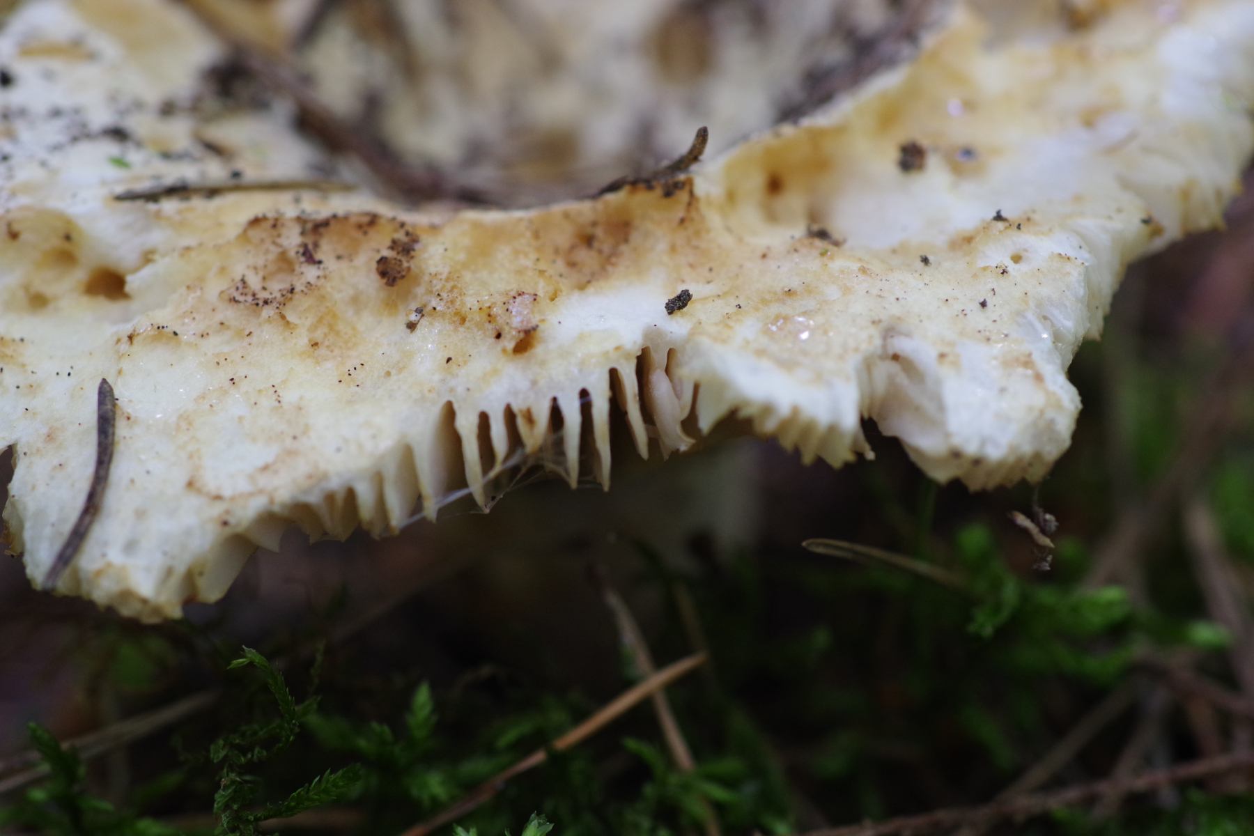 Hallo allerseits, dieser Pilz wächst bei Fichten und Kiefern, etwas weiter weg noch jüngere Bäume von Eiche, Ahorn und Birke. Hielt ich erst für einen Täubling, ist aber wohl doch ein Milchling, nur dass die Milch klar ist. Der Geruch ist relativ schwach und enthält eine leichte Heringsnote. Verkostet habe ich ein Stück vom erwartungsgemäß brechenden und ziemlich saftigen Stiel, der von der Konsistenz her ziemlich hart ist, wie frische Haselnuss. Im Nachklapp mit deutlicher, brennender Schärfe. Leider haben die Schnecken wenig übergelassen, wonach man die Hutfarbe beurteilen könnte, am ehesten wohl weiß bis maximal helles Ocker.