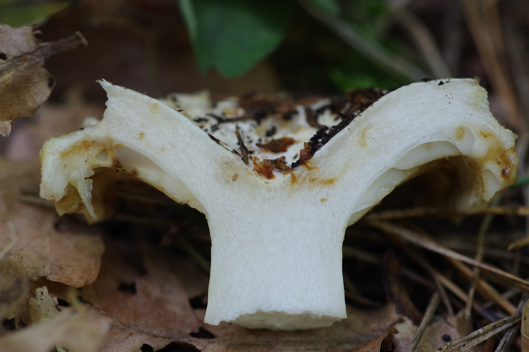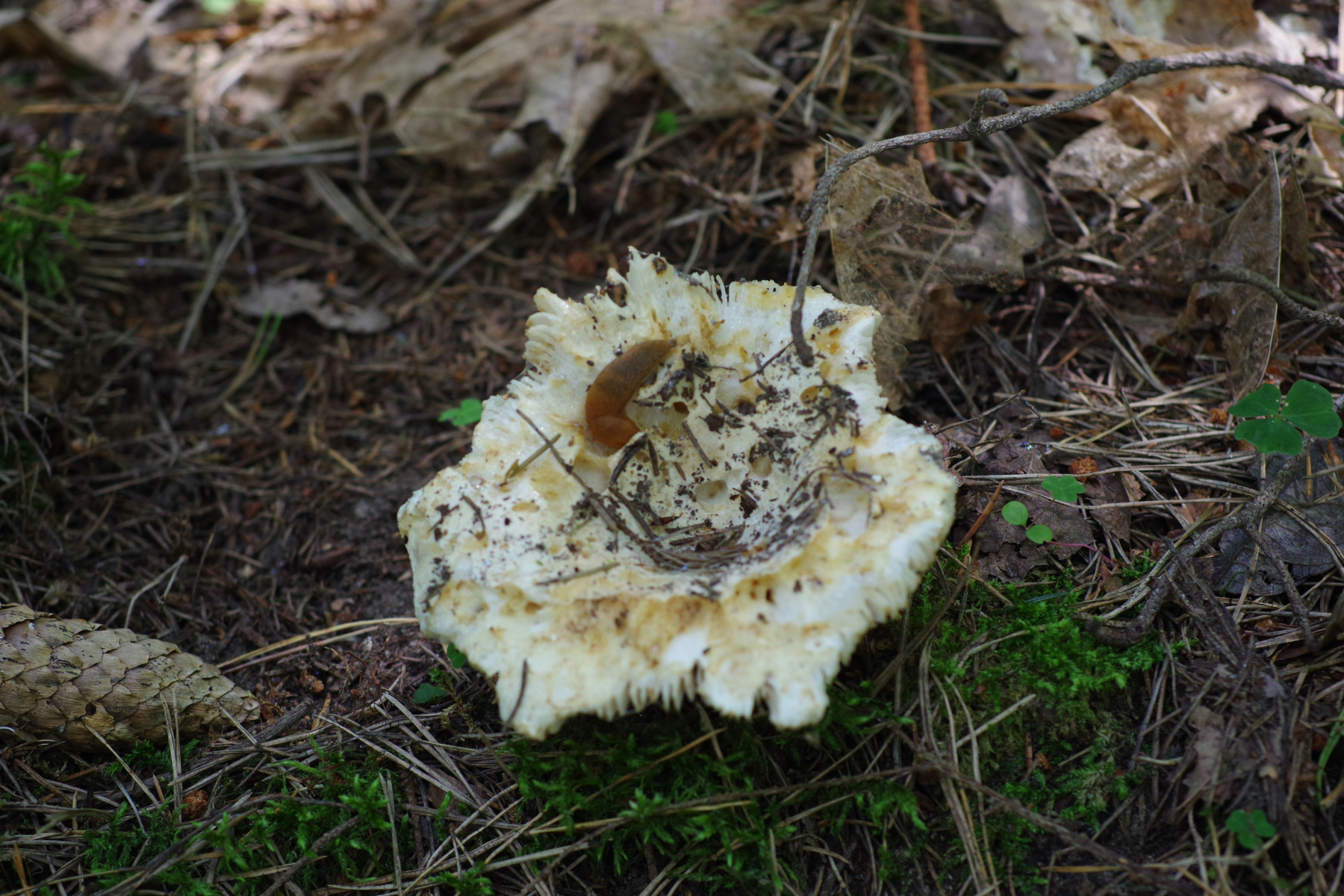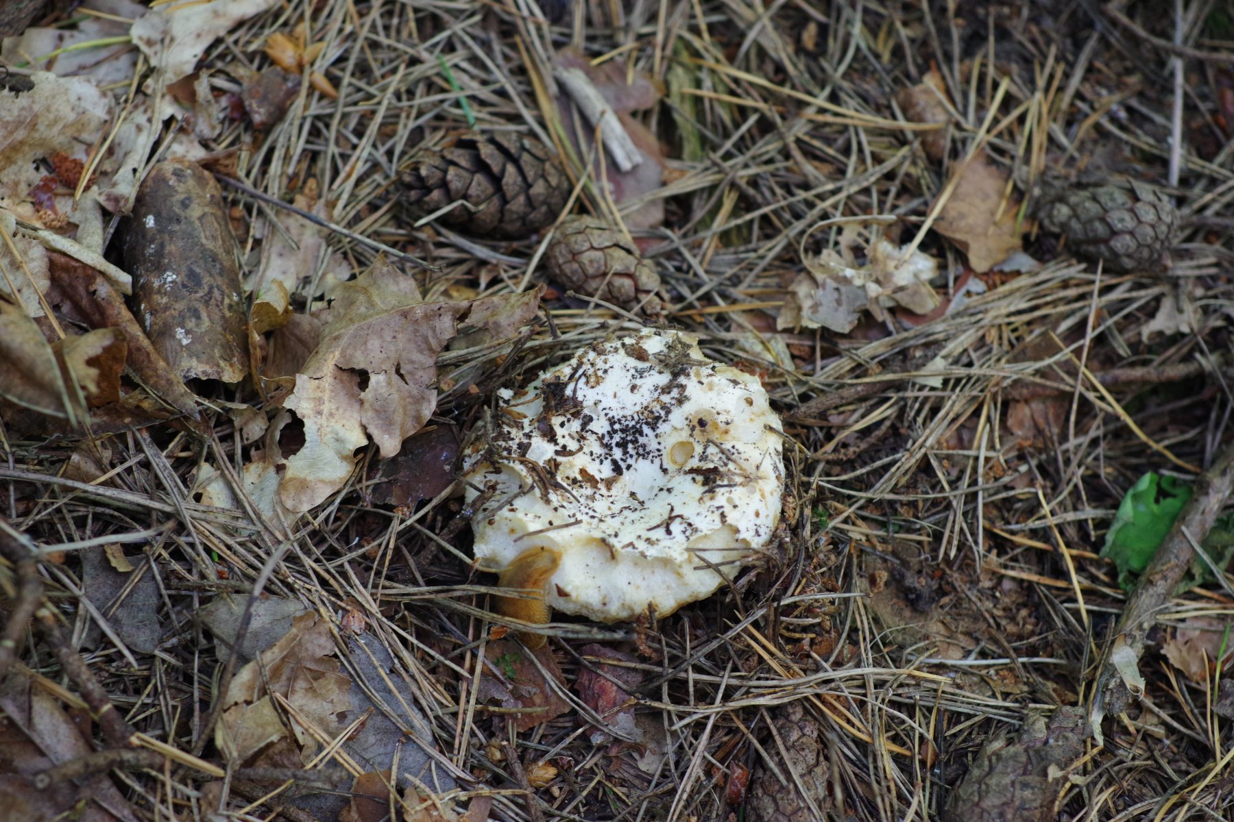 Hallo allerseits, dieser Pilz wächst bei Fichten und Kiefern, etwas weiter weg noch jüngere Bäume von Eiche, Ahorn und Birke. Hielt ich erst für einen Täubling, ist aber wohl doch ein Milchling, nur dass die Milch klar ist. Der Geruch ist relativ schwach und enthält eine leichte Heringsnote. Verkostet habe ich ein Stück vom erwartungsgemäß brechenden und ziemlich saftigen Stiel, der von der Konsistenz her ziemlich hart ist, wie frische Haselnuss. Im Nachklapp mit deutlicher, brennender Schärfe. Leider haben die Schnecken wenig übergelassen, wonach man die Hutfarbe beurteilen könnte, am ehesten wohl weiß bis maximal helles Ocker.