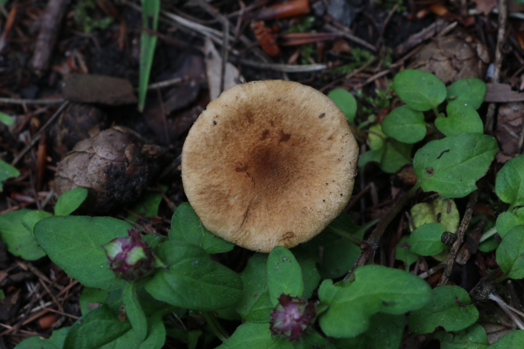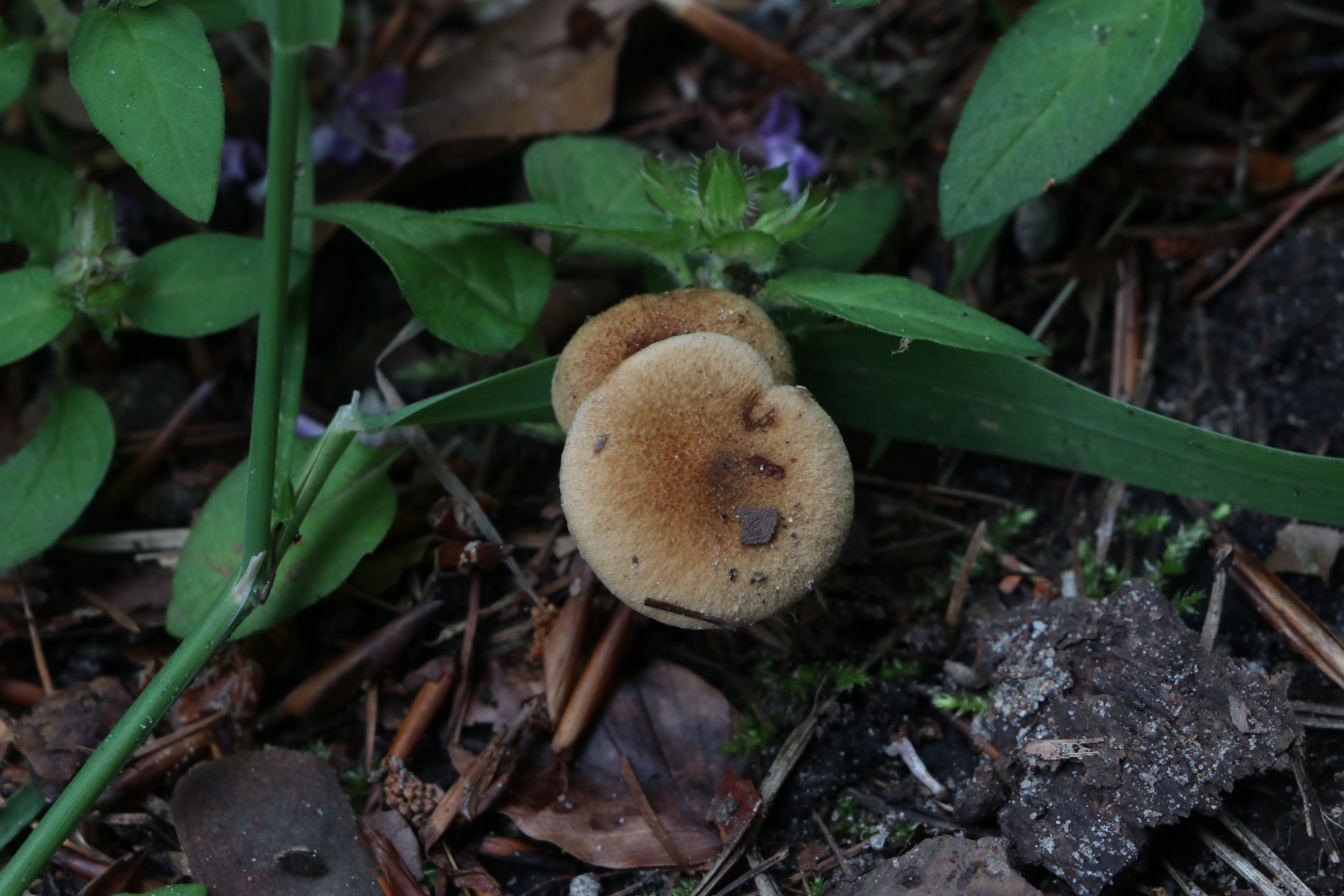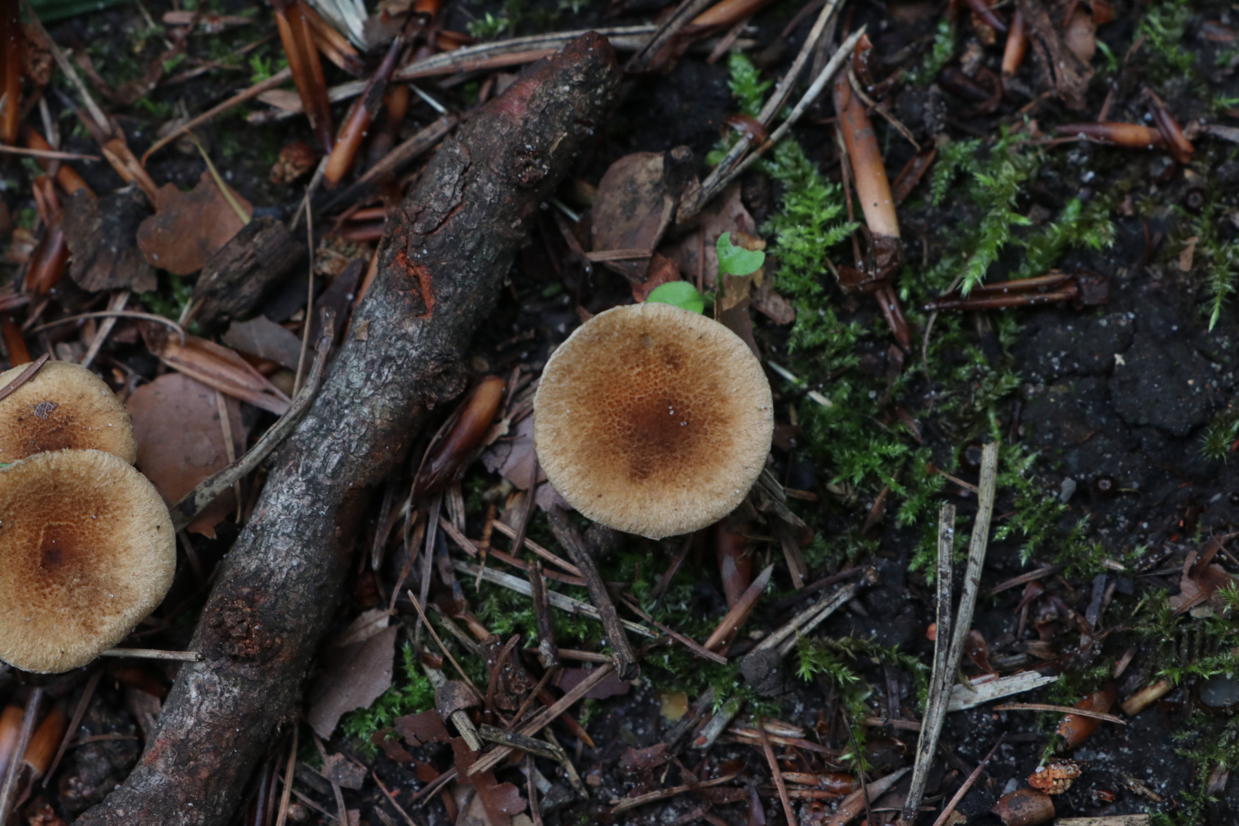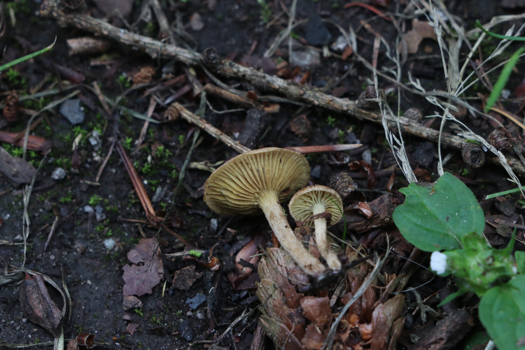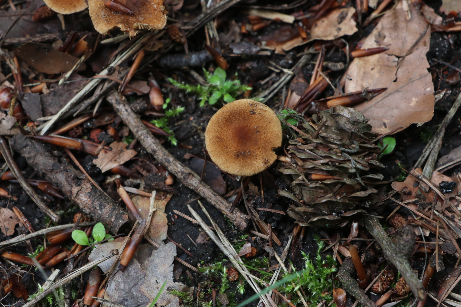 heute habe ich auf einem kleinen Waldspaziergang die folgenden Risspilze gefunden. Sie wuchsen sehr gesellig (um die 20 Fruchtkörper) direkt am Weg zwischen Kräutern und Pflanzenresten bzw. Holzstückchen. Direkt in der Nähe wuchsen Kiefer, eine Lärche und junge Buchen. Auffällig fand ich die teilweise recht gelben Lamellen mit einem Olivstich, wenn sie dunkler waren. Die meisten von ihnen waren recht klein (ca. 1,5-3cm), nur einer war etwas größer (so um die 4-5cm)