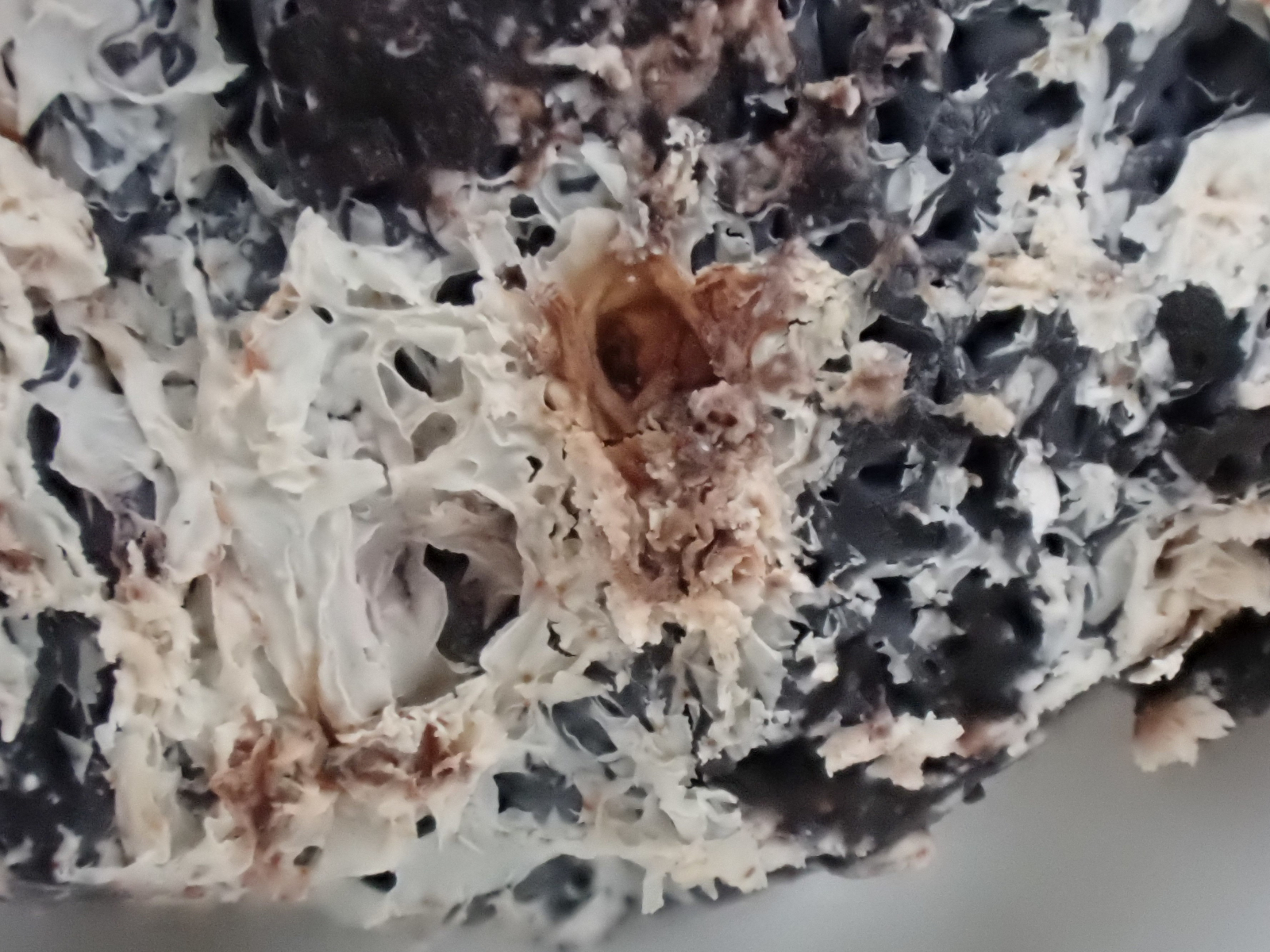 Erst dachte ich Mucilago crustacea, aber diese rote Flüssigkeit? und die Zeit passt auch nicht, oder?