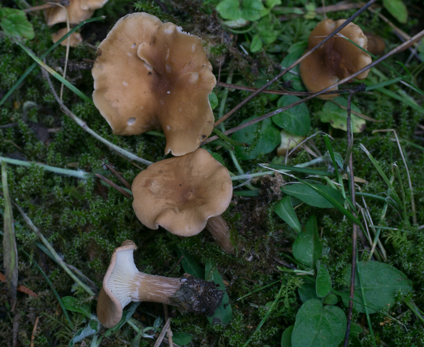 9. Die hier finde ich schwierig. Ich bei bei Gymnopus am Suchen aber finde nix passendes. Die standen gesellig im Moos unter Roteichen. Hygrophan. Erstmal nix gerochen also dachte ich vlt. Gymnopus inodorus. Beim Quetschen aber schon eine unangenehme Komponente, die fauliger Kohl sein könnte. Freundin meinte "Rettich". Also doch einer der Stinkschwindlinge oder kann der geruchlose Schwindling auch Gerüche? Gymnopus impidicus vielleicht? Oder bin ich ganz falsch?