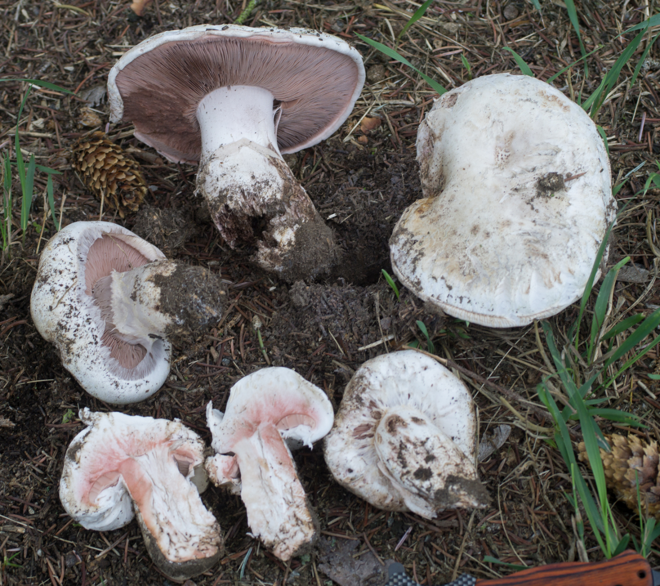 4. Das wäre ein Erstfund für mich, wenn ich richtig liege. In der Nadelstreu standen diese kräftigen, hartfleischigen Champignons mit intensiver Rötung und etwas unangenehmen Geruch.