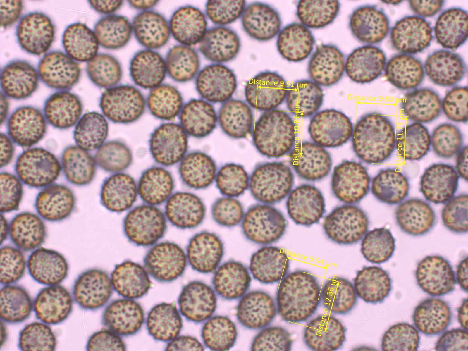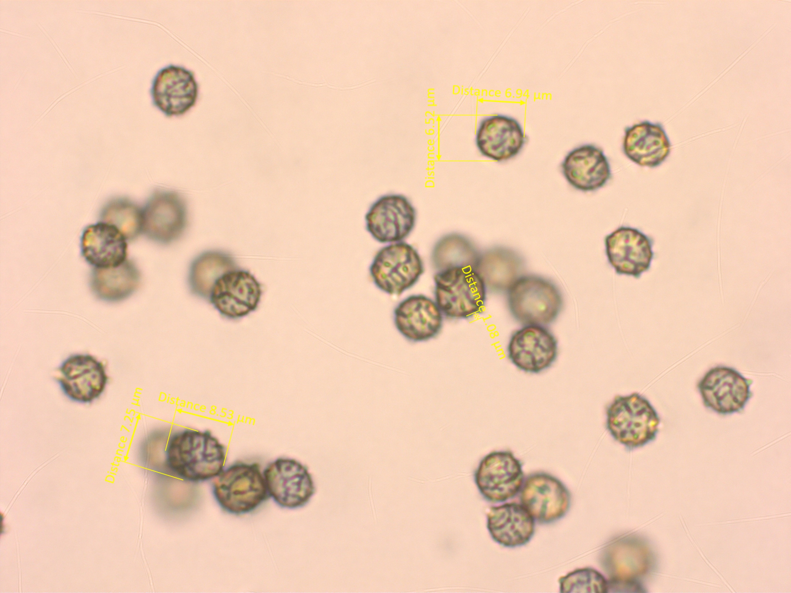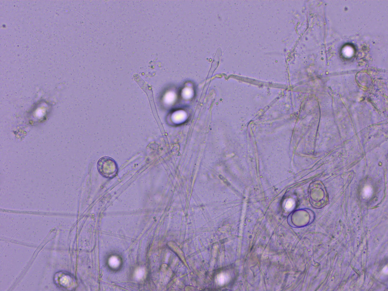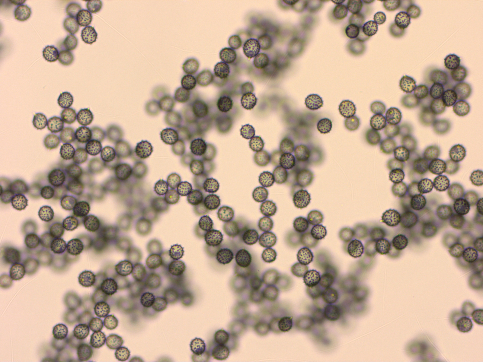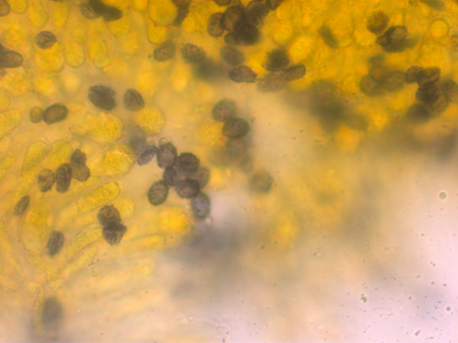 Sporen rundlich, sehr gross, im Schnitt über 10 µm lang, manche bis 12.5x10 µm, isoliert warzig.