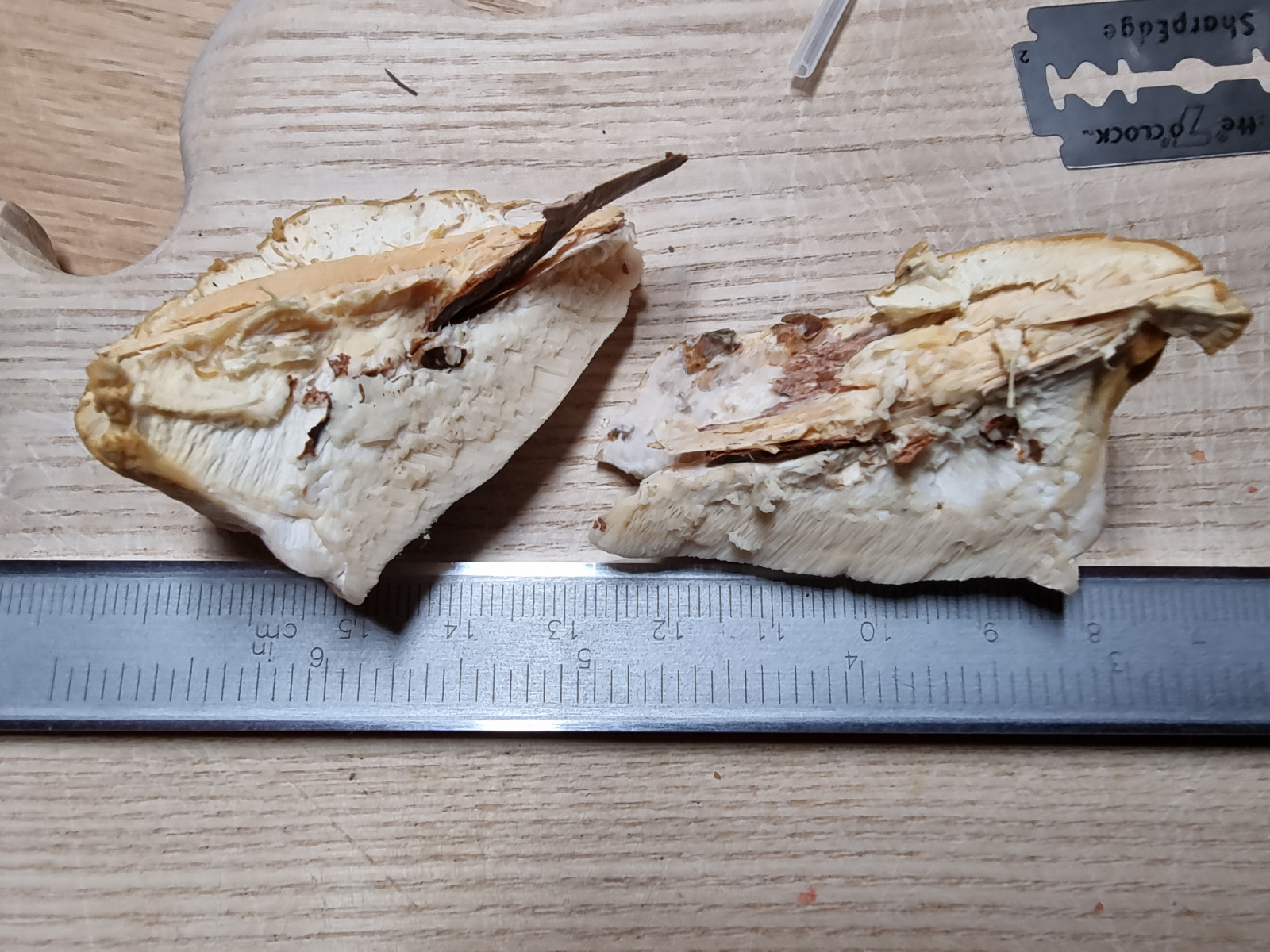 Äusserlich an R. fellea erinnernd. Ist aber mild, Geruch schwach fruchtig. KOH negativ, Eisensulfat im Fleisch blassgrau.