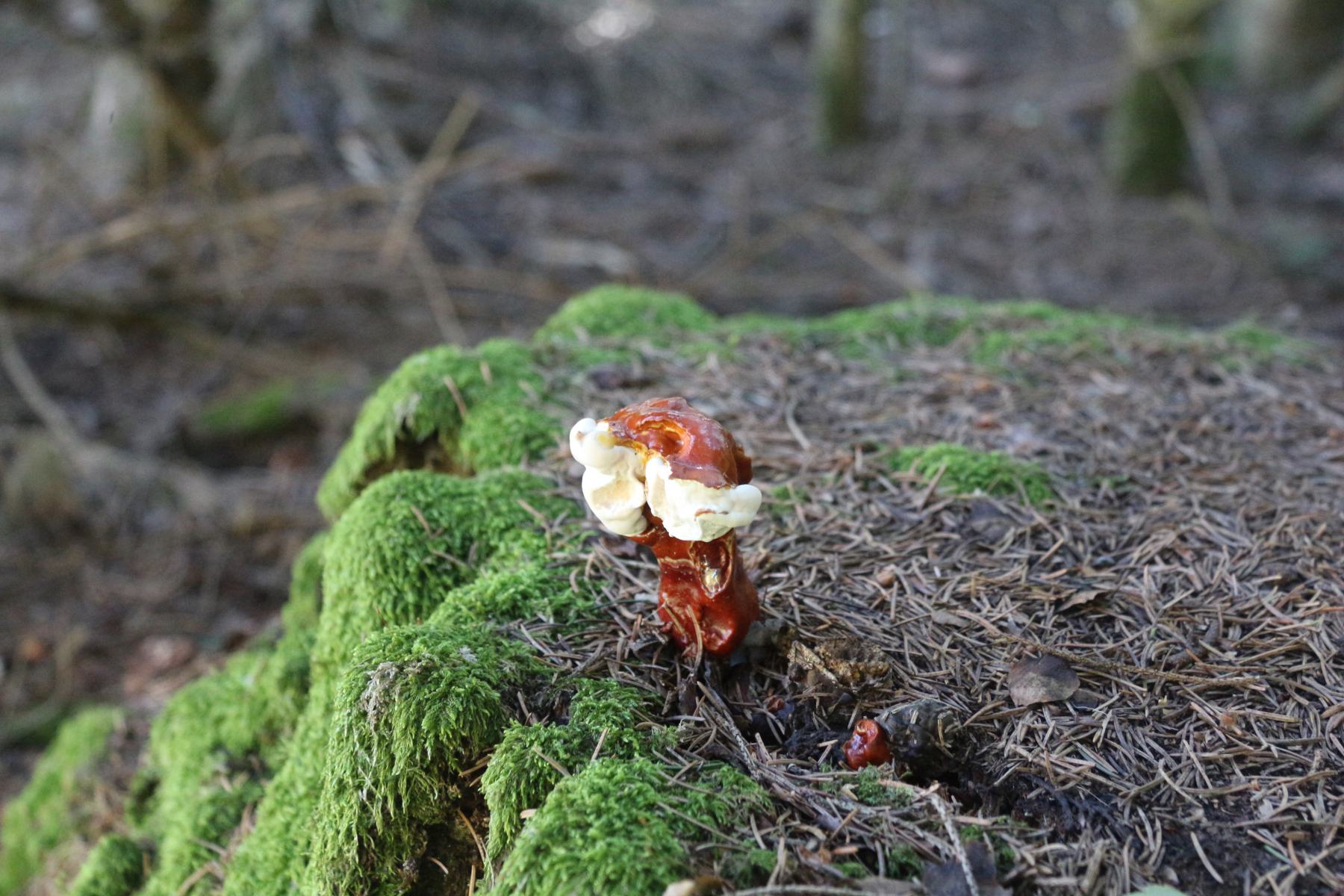 Und frage mich aber jetzt irgendwie: Wie sehen die Fruchtkörper von Ganoderma lucidum aus, wenn sie oben aus einem stark morschen Baumstumpf herauswachsen?
