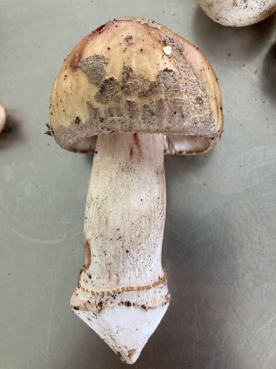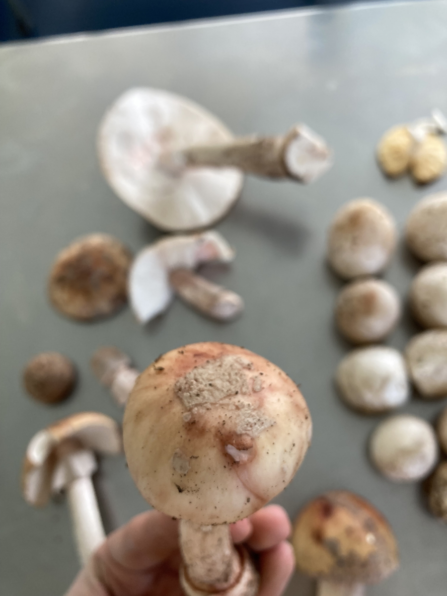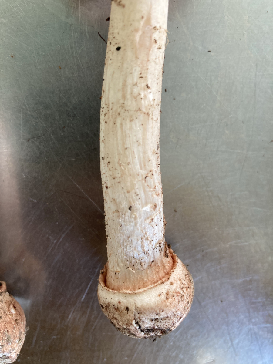 Knolle: Hier liegt mein Problem. Bei den meisten zeigt sich, wie ich es für Perlpilze erwarten würde, ein kontinuierlicher Übergang. Bei einigen (s. Bilder) ist dieser aber deutlich abgesetzt. Zwar nicht so deutlich wie beim Pantherpilz, aber doch eindeutig sichtbar. Handelt es sich dabei um eine Unterart des Perlpilzes oder um eine andere (eingewanderte oder seltene) Art?