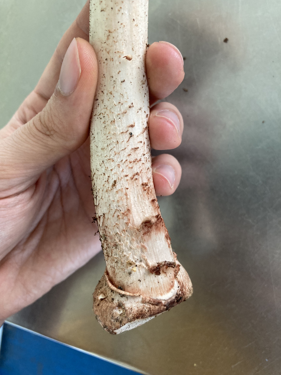 bei der deutlichen Rotfärbung und der Bilderbuch-mäßig gerieften Manschette kommt wohl nichts anderes als Perlis in Frage. Ich finde deine Anfrage in dem Punkt der Knolle aber ebenfalls interessant. Da könnte man schon "Kindersöckchen" interpretieren. Ich hatte das auch immer als eindeutiges Ausschlusskriterium verstanden.