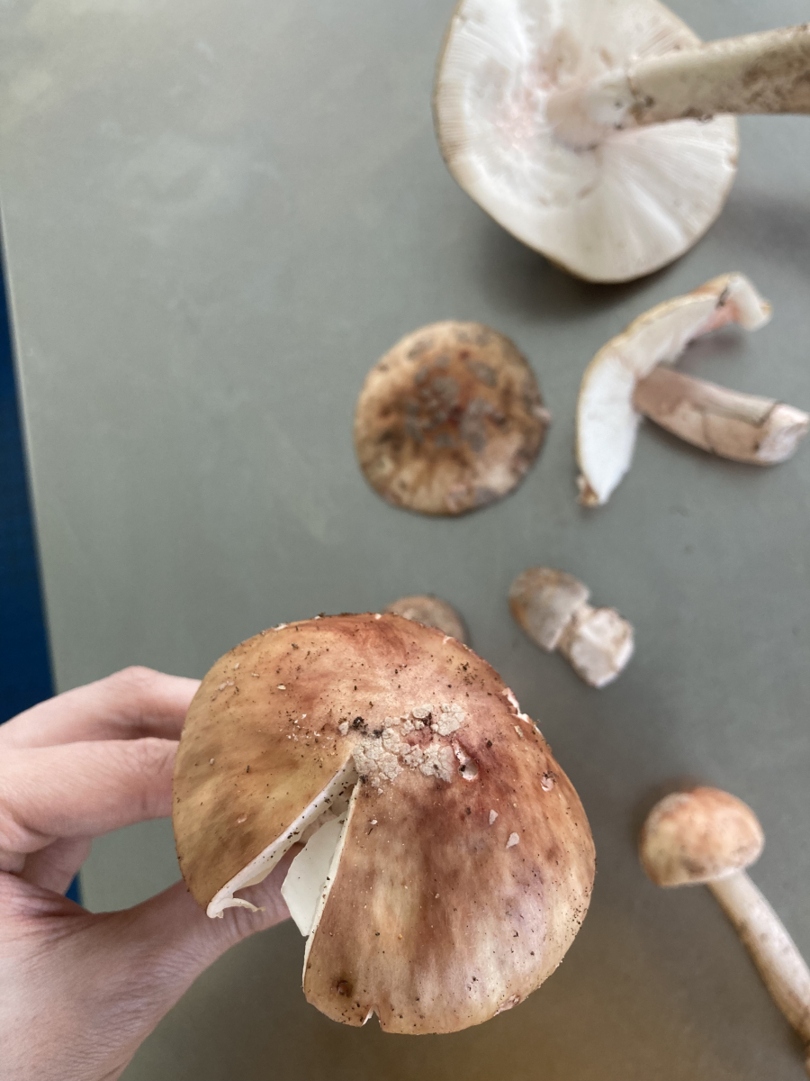 Hut: rötlich, Perlmutt-gefärbt, graue Gesamthüllreste, ungeriefter Hutrand.