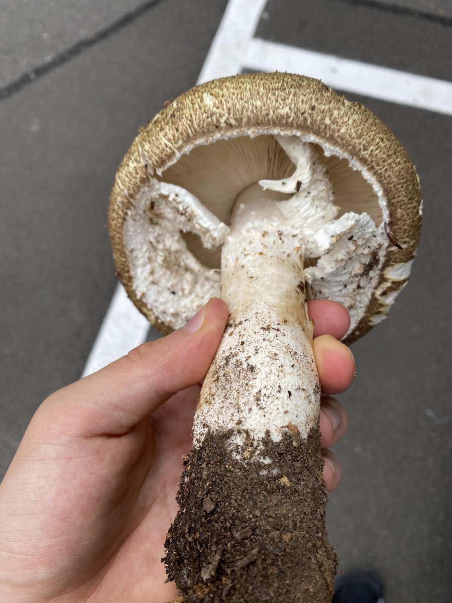ich habe heute beim wandern am Wegesrand einen einzelnen Pilz unter einem Nadelbaum gefunden er wirkte im ersten Moment wie ein parasol das glaube ich aber nicht mehr.