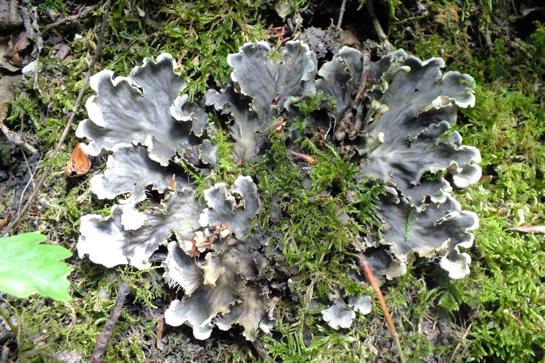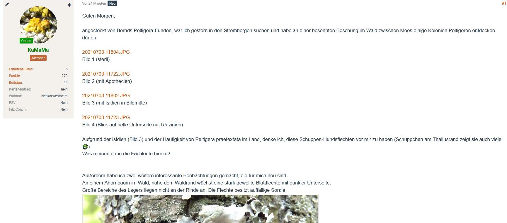 angesteckt von Bernds Peltigera-Funden, war ich gestern in den Strombergen suchen und habe an einer besonnten Böschung im Wald zwischen Moos einige Kolonien Peltigeren entdecken dürfen.