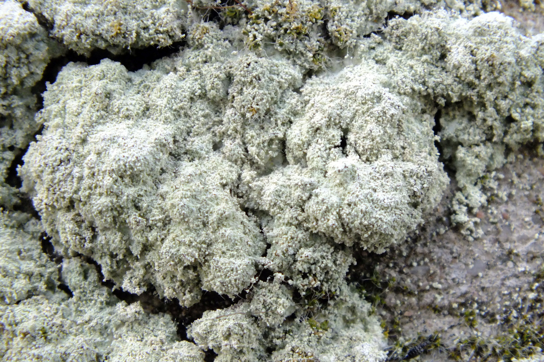 Und ferner, an einer Sandsteinmauer an Dorfrand dicke, graugrüne Polster aus leprös wirkendem Lagern teilweise auf Moos aufsitzend.