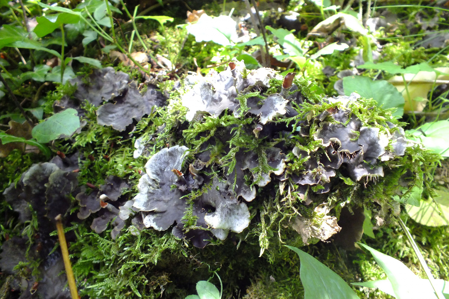 angesteckt von Bernds Peltigera-Funden, war ich gestern in den Strombergen suchen und habe an einer besonnten Böschung im Wald zwischen Moos einige Kolonien Peltigeren entdecken dürfen.