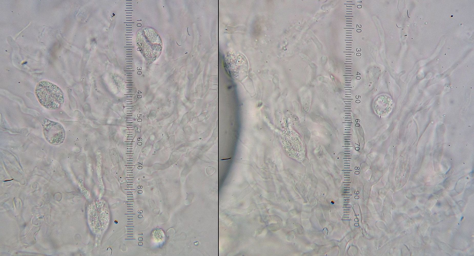 ich habe getrocknetes Material angeschaut. Phragmobadidien (sind das in diesem Fall diese fingerförmigen Zellen an den Sporen?) habe ich keine gesehen, Sporen ebenfalls nicht. Allerdings habe ich keine einzige Schnalle gesehen und noch Trockenmaterial übrig, falls ich nochmal Lust habe, weiter zu suchen.