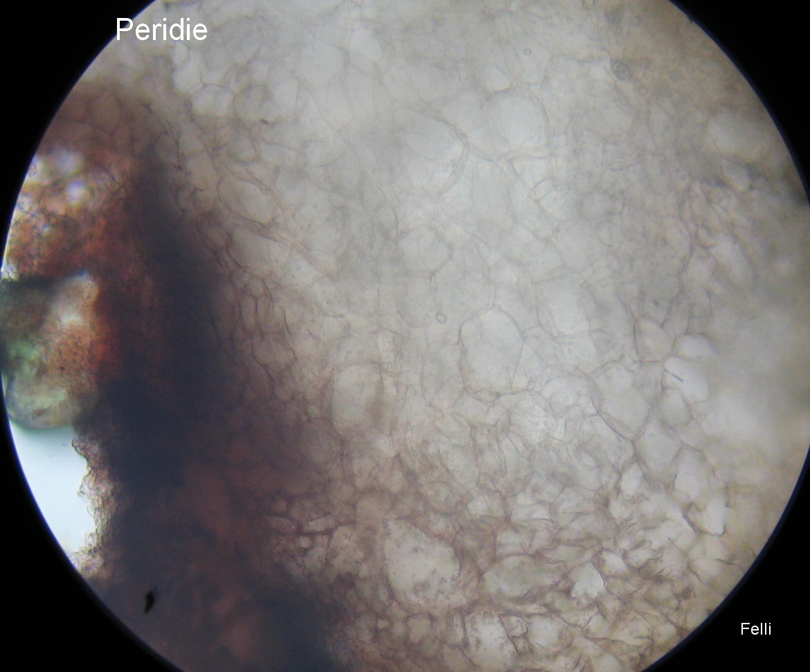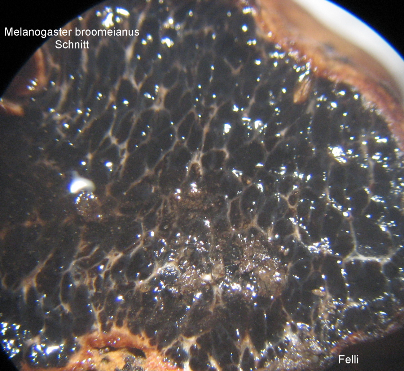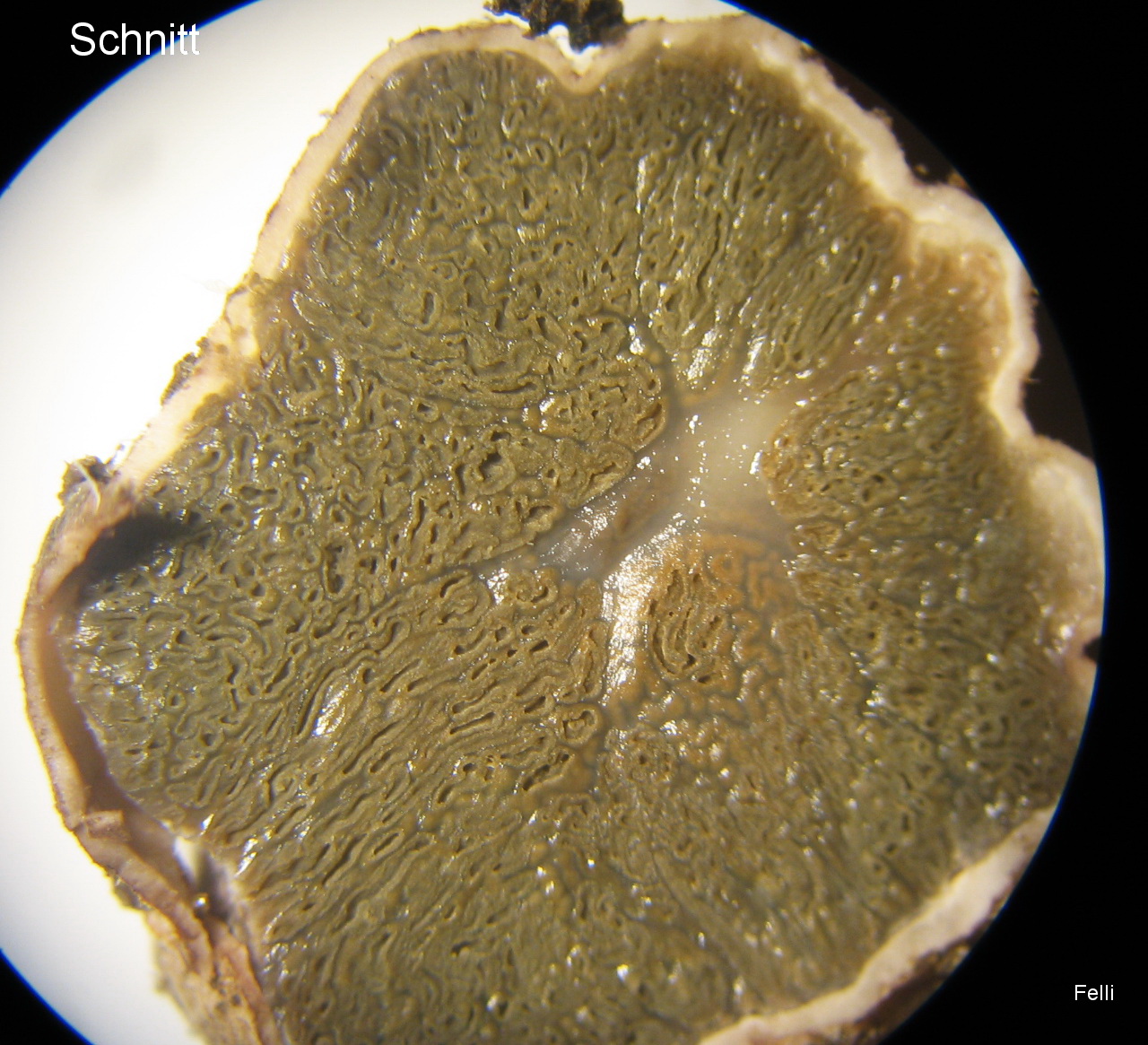 Fruchtschicht olive-grün, Kammern länglich, relativ groß, mit gelantinösen Venen durchzogen.