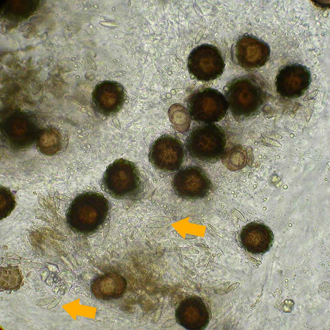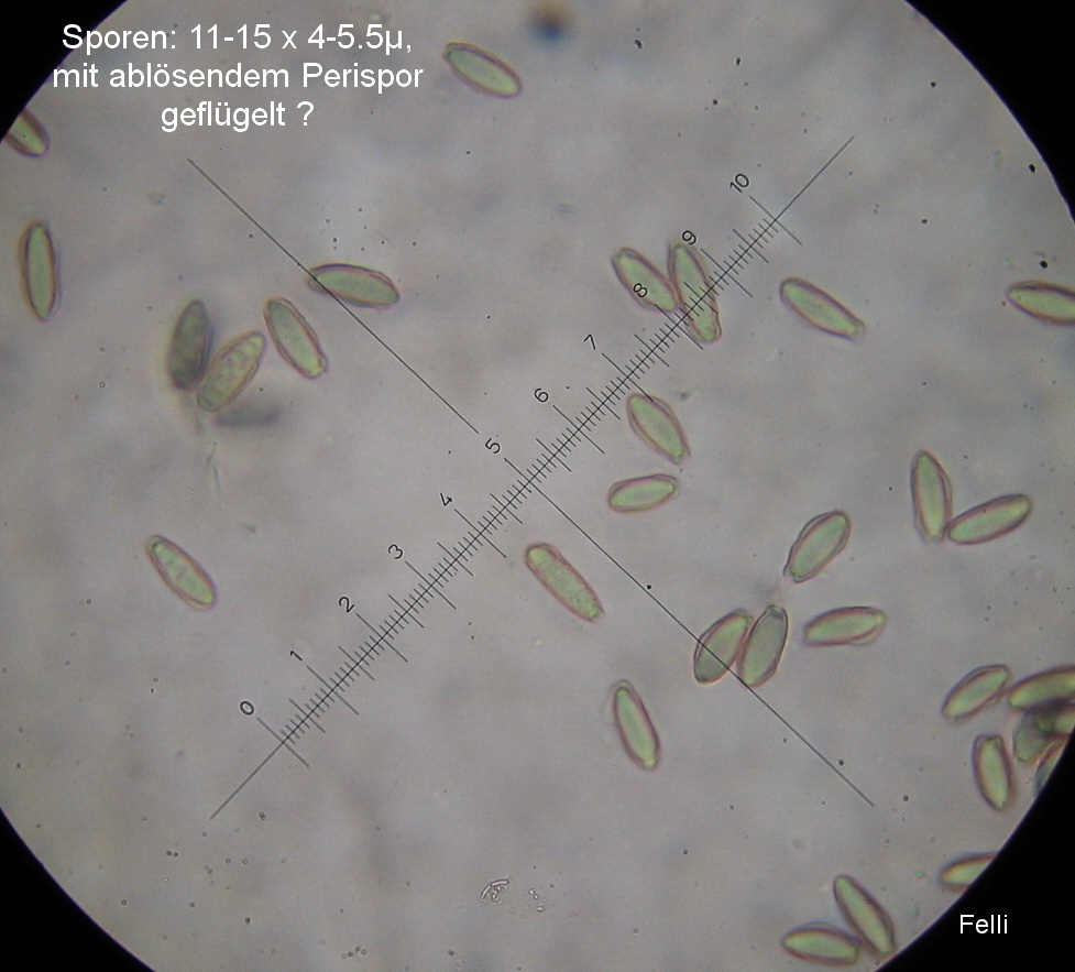 Sporen zylindrisch, 11-15 x 4-4,5µ. mit ablösender Sporenhaut