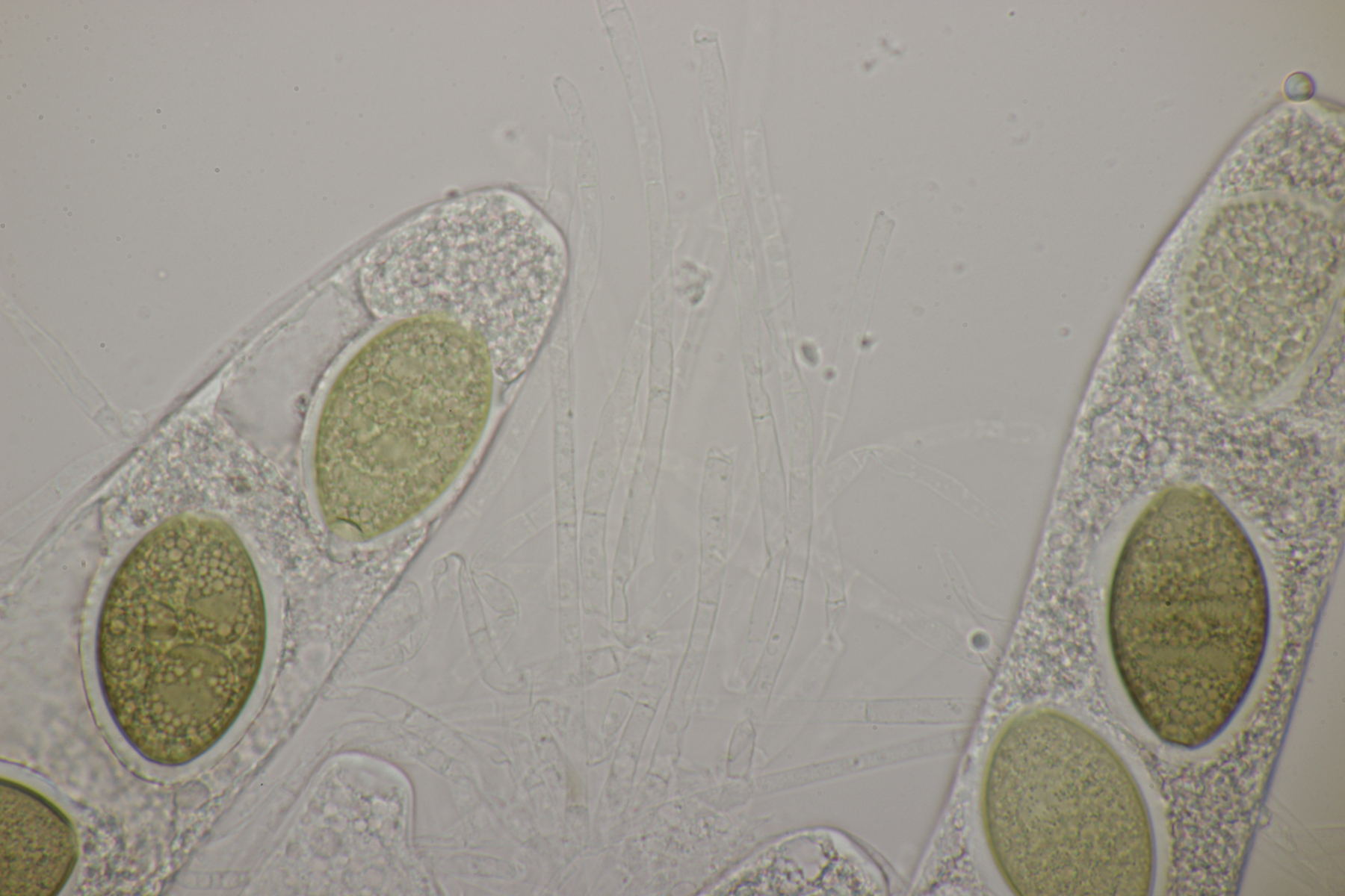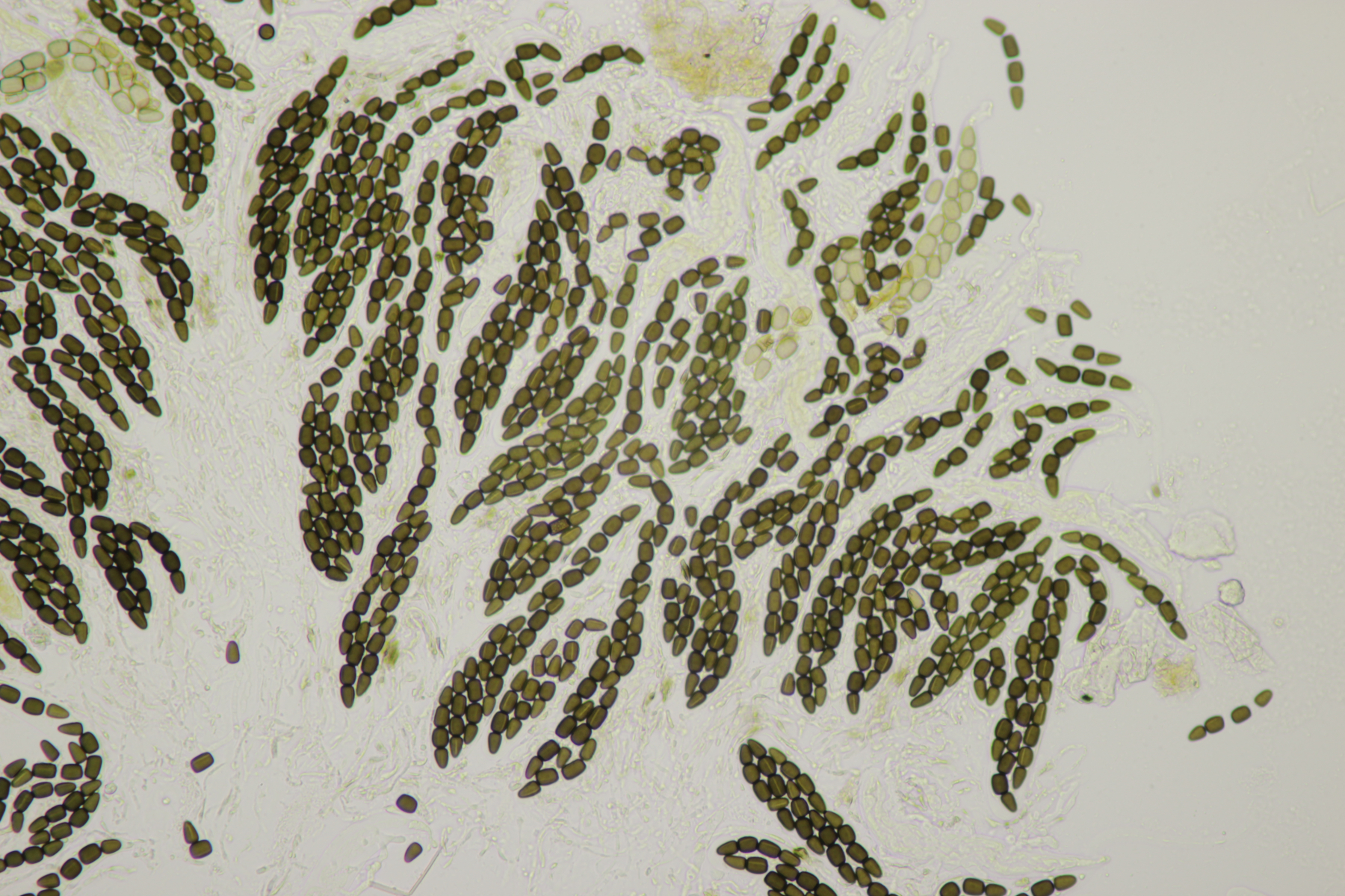 2. Eine Sporormiella mit Sporen von 46-50 µm x 9,5-10 µm, transversalen Septen, gechwungener Keimspalte und Asci mit kurzem Fuß, womit ich dann bei Sporormiella intermedia lande.