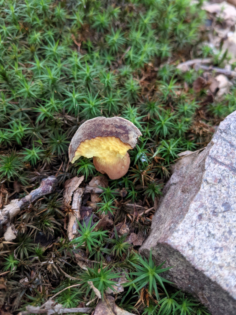 Den Pilz 1 finden wir momentan übrigens öfters, auffällig sind hier die wirklich intensiv gelben Röhren und der maronenbraune Hut.