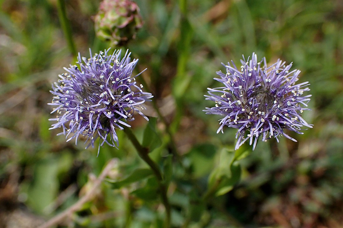 Nicht zu übersehen in den Kalk-Magerwiesen waren die Kugeligen Teufelskrallen (Phyteuma orbiculare), hier zwei Blütenstände in verschiedenen Altersstadien.