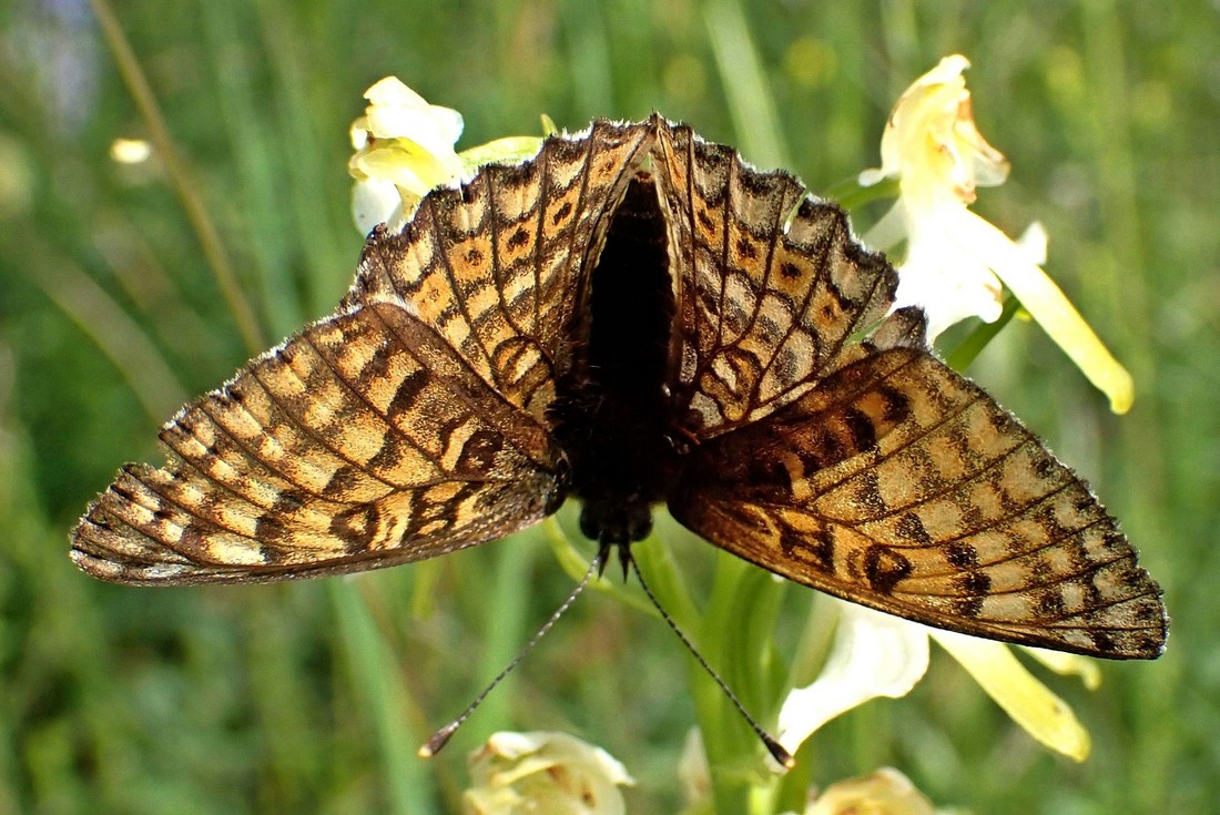Wegerich-Scheckenfalter (Melitaea cinxia). Das war der, welcher auf Deiner Hand saß, Meli.