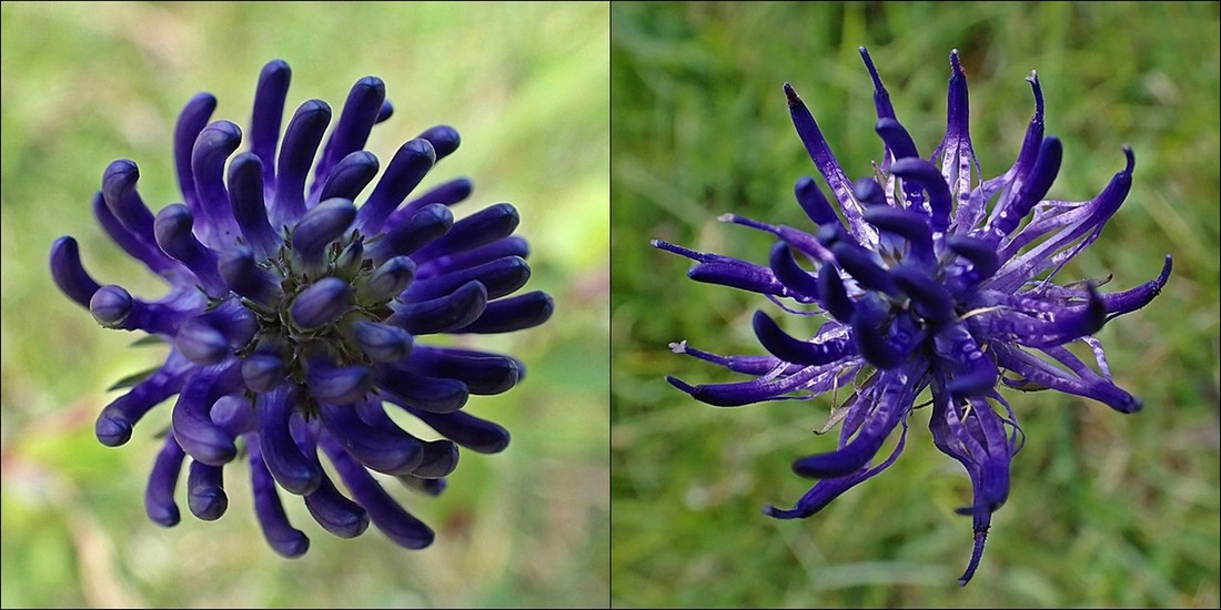 Nicht zu übersehen in den Kalk-Magerwiesen waren die Kugeligen Teufelskrallen (Phyteuma orbiculare), hier zwei Blütenstände in verschiedenen Altersstadien.