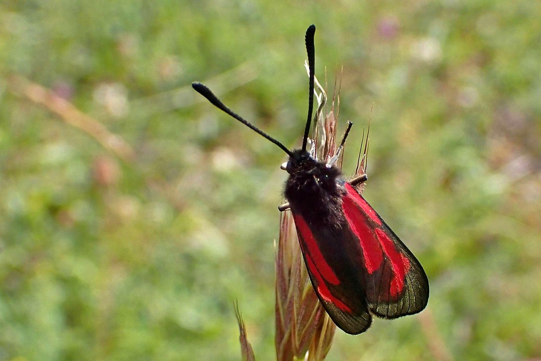 Ein weiteres Widderchen, dessen Flügelflecken zu drei Streifen zusammengeflossen waren, entpuppte sich als Thymian-Widderchen (Zygaena purpuralis).