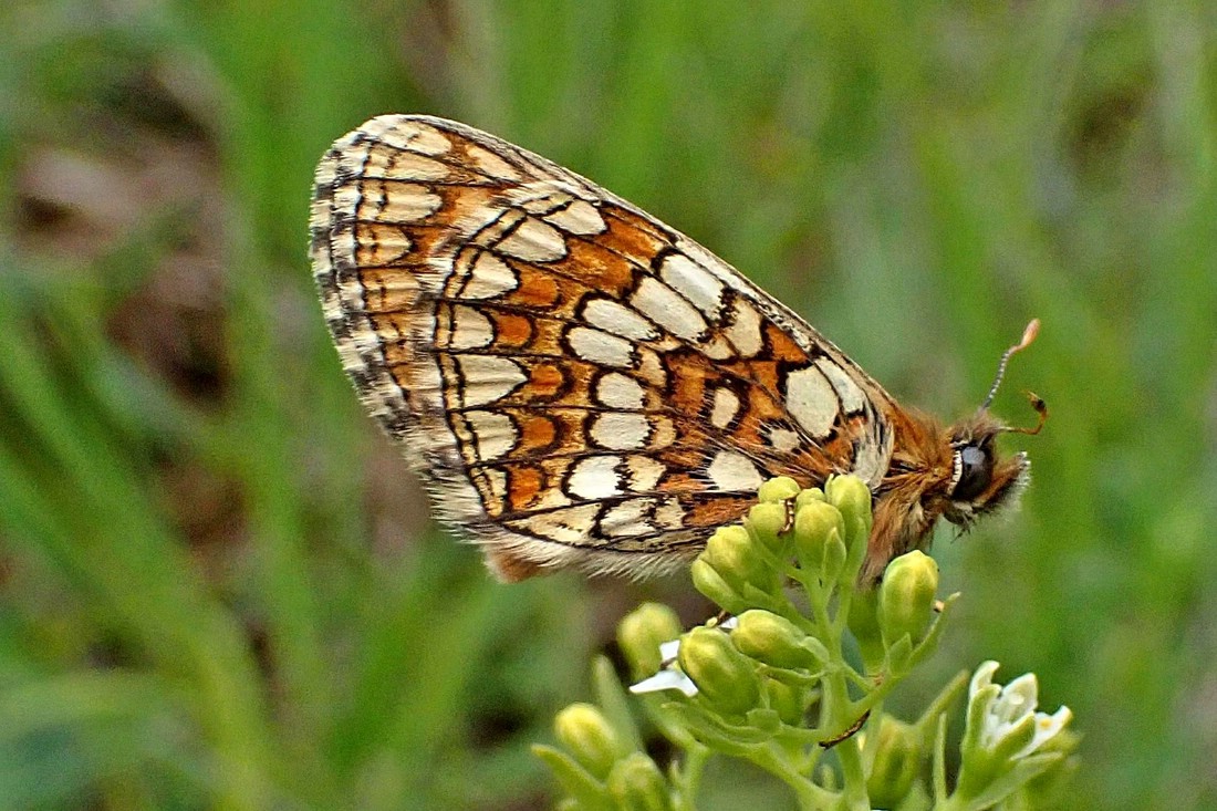 Wegerich-Scheckenfalter (Melitaea cinxia). Das war der, welcher auf Deiner Hand saß, Meli.